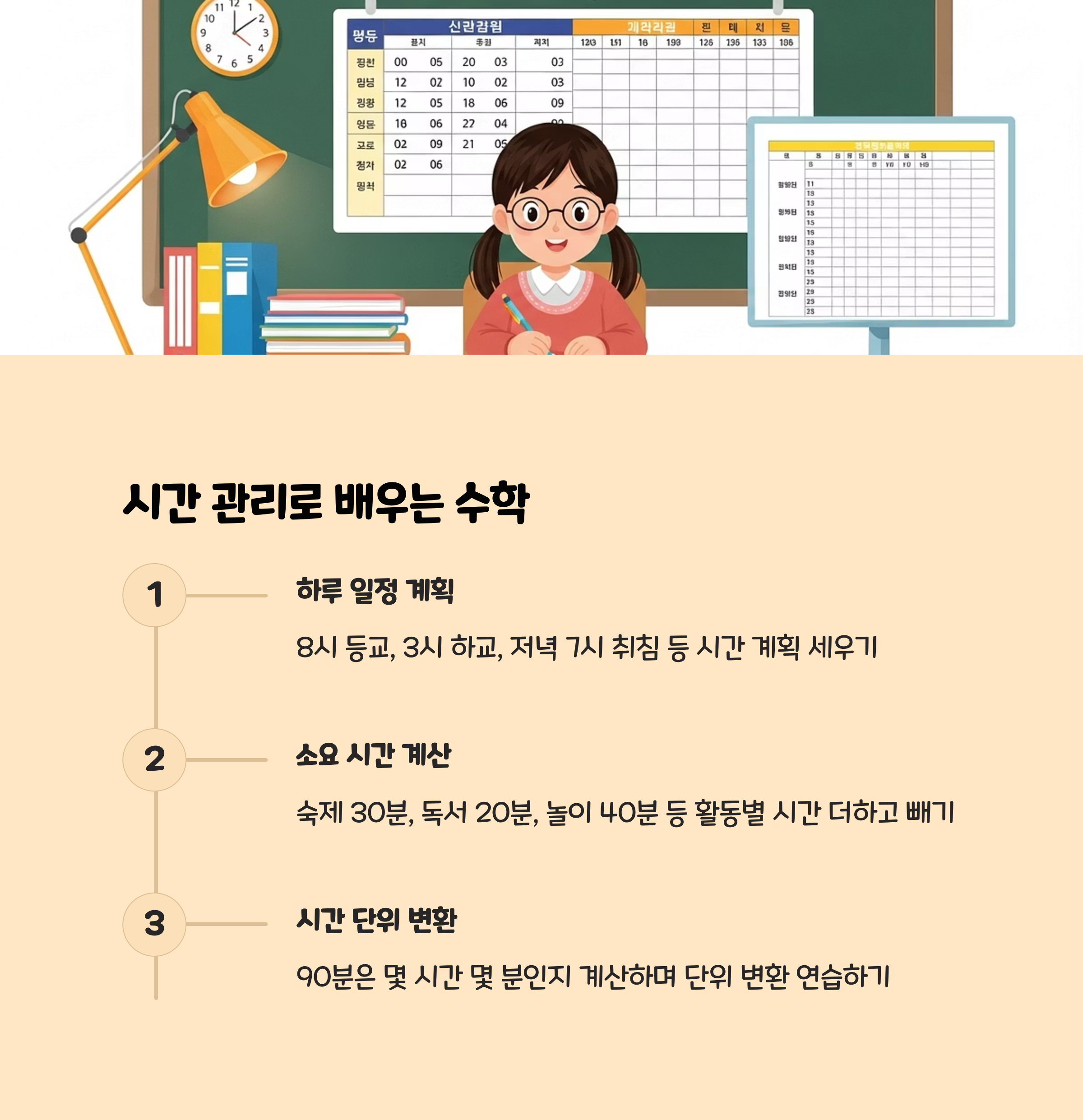 | 시간 관리 | 시계 읽기, 시간 계산 | 9시 시작, 2시간 후 11시 종료 |