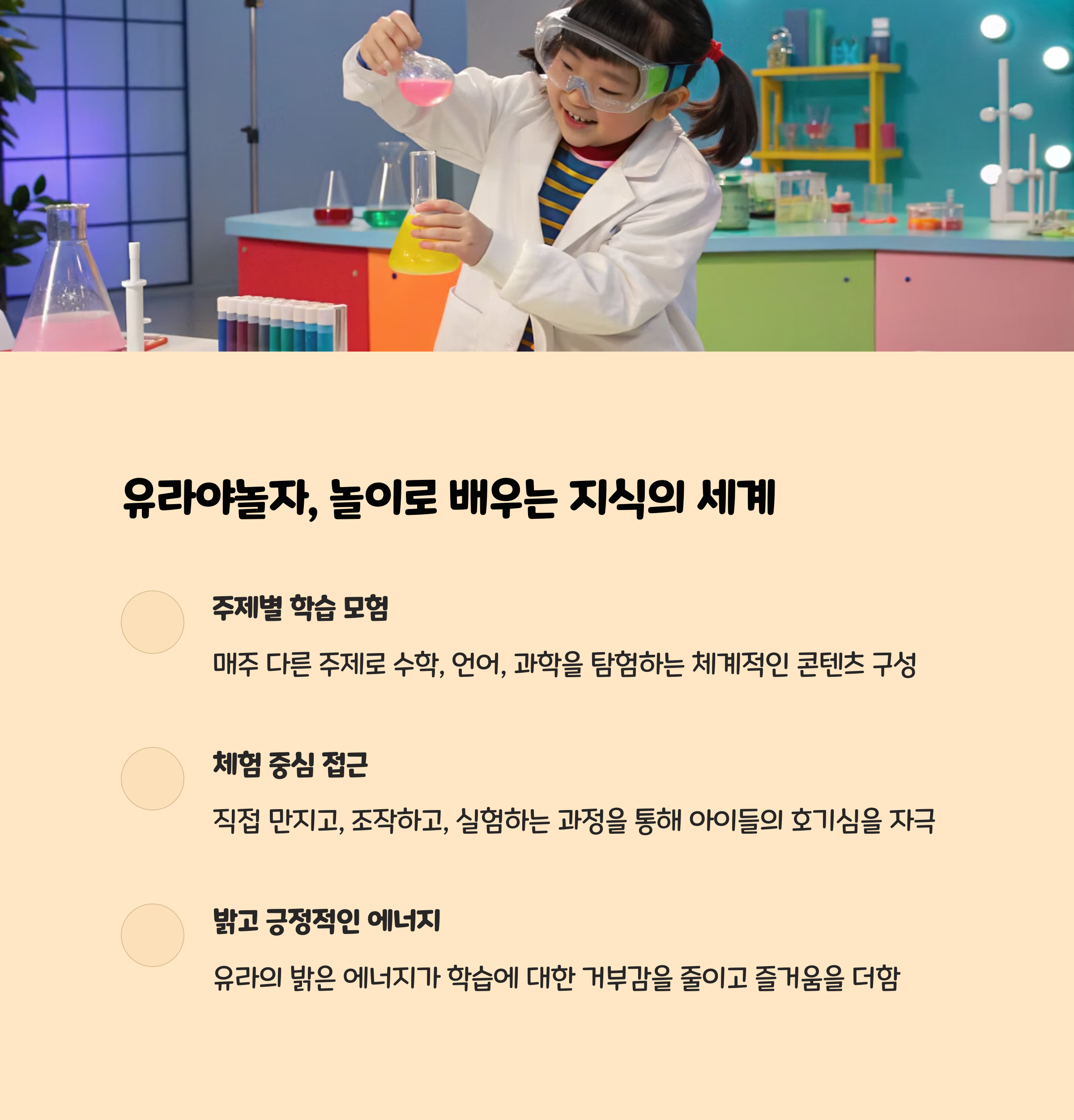 • 특징 : 장난감을 활용한 상황극, 동물 키우기 체험, 과학 실험, 동화 등 다양한 콘텐츠를 아이들의 눈높이에 맞춰 제공합니다. 정서와 인성 발달에 중점을 둔 역할극이 특히 인기가 많습니다.