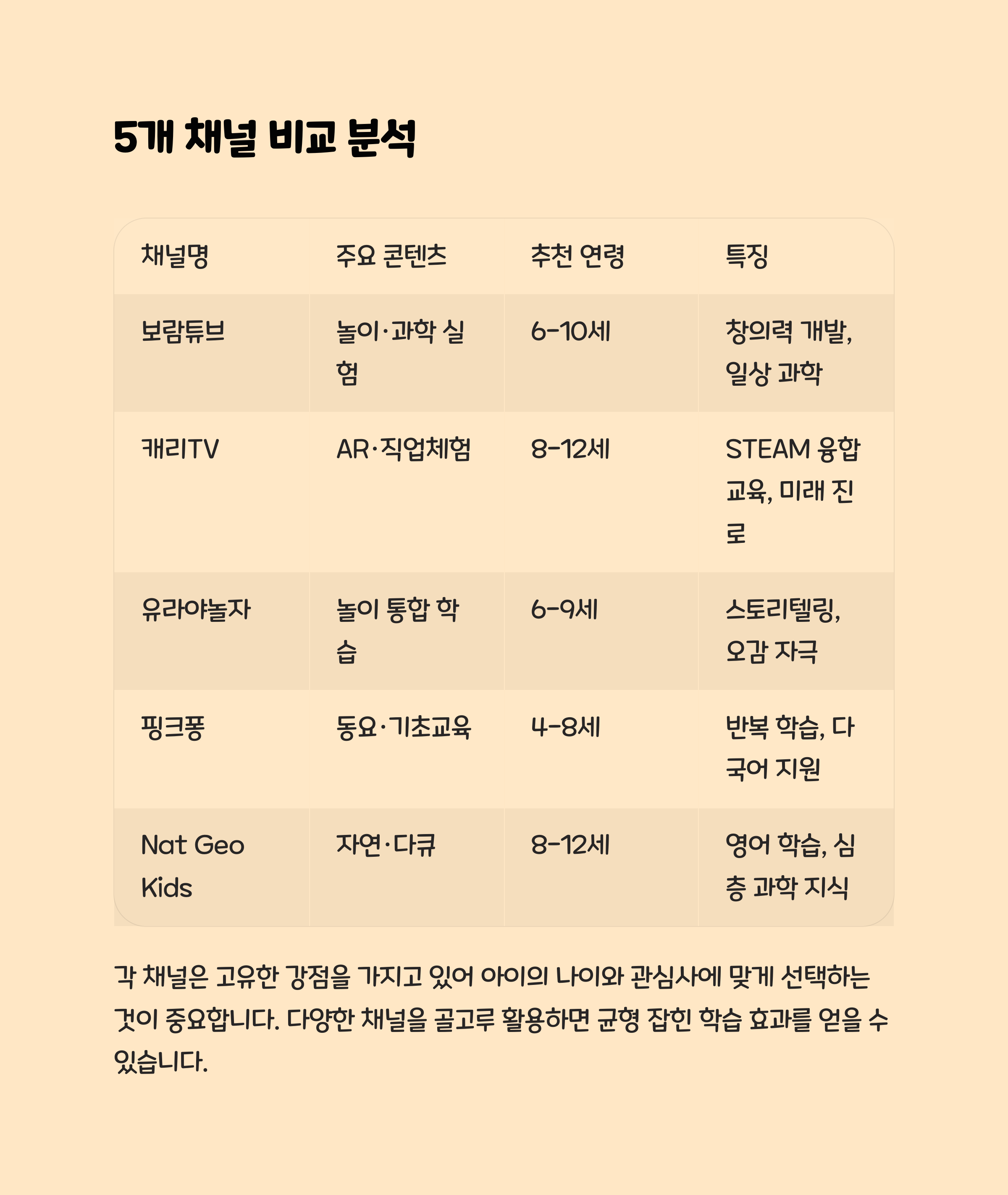 - 연령에 맞는 콘텐츠 선택 : 초등 저학년과 고학년의 관심사와 이해 수준이 다르므로, 아이 나이에 맞는 채널을 선택하는 것이 중요합니다.