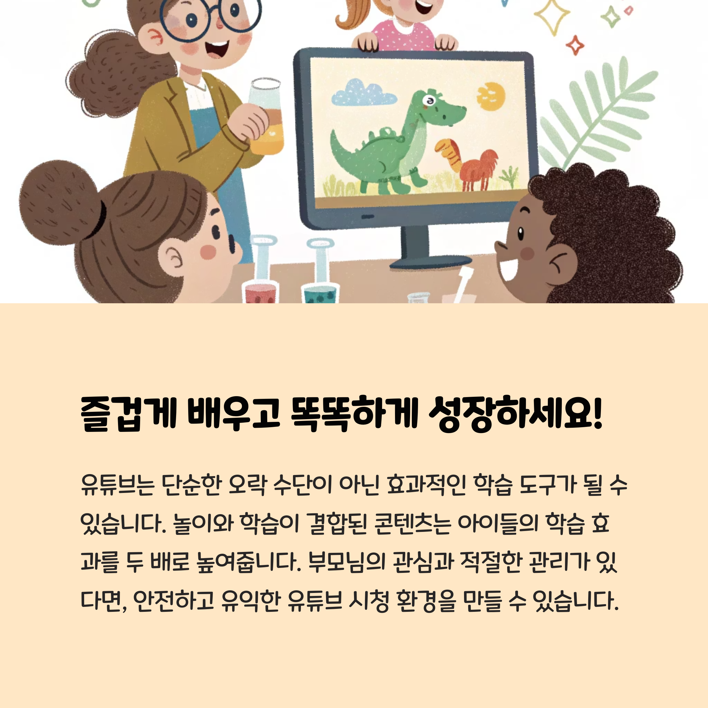 • 연령에 맞는 콘텐츠 선택 : 초등 저학년과 고학년의 관심사와 이해 수준이 다르므로, 아이 나이에 맞는 채널을 선택하는 것이 중요합니다.