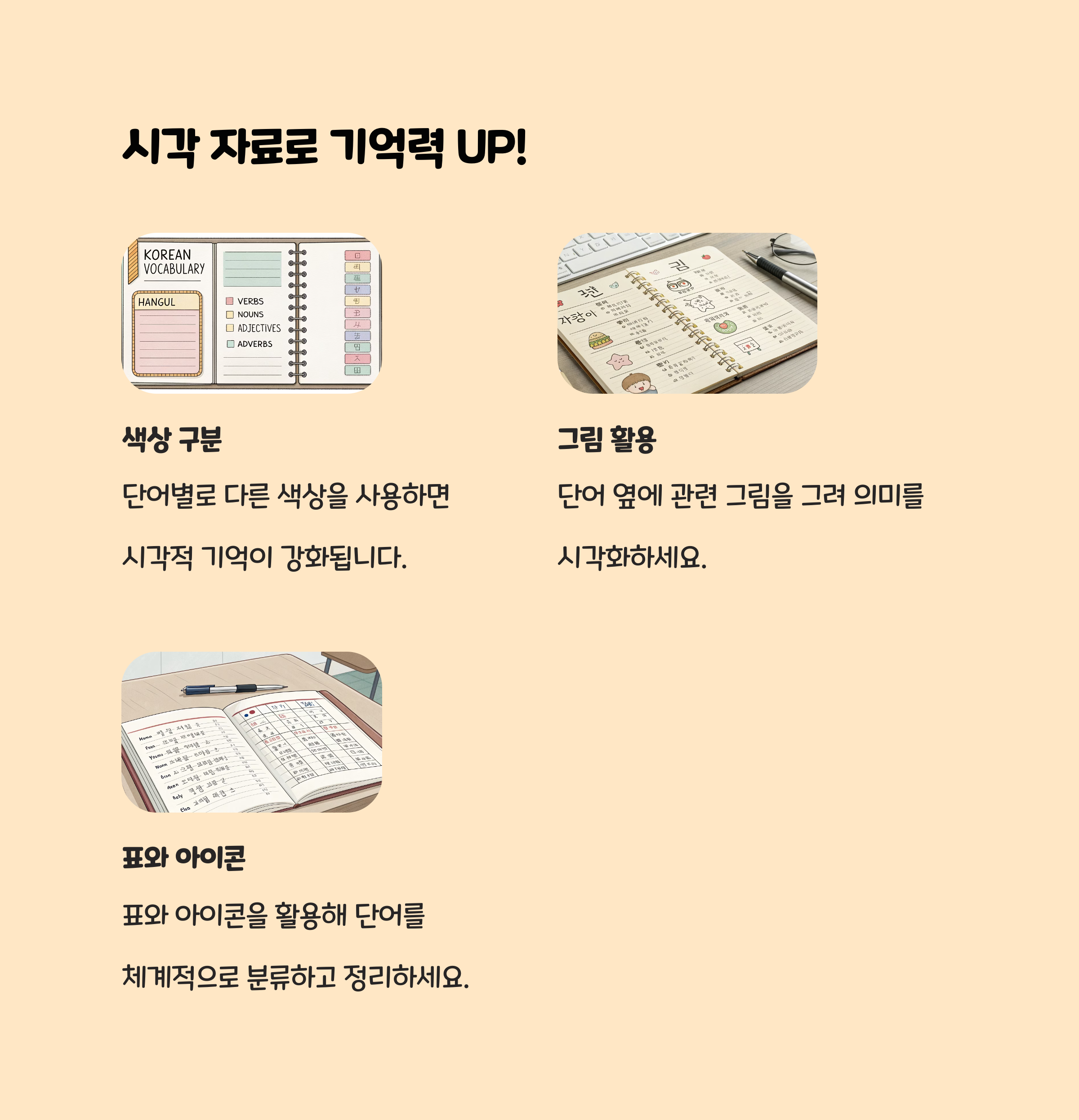 이미지, 색상, 표, 그림 등 시각 자료를 적극 활용하면 기억에 오래 남습니다.- 예를 들어, 비슷한 뜻의 단어는 같은 색으로 표시하거나, 헷갈리는 단어는 표로 정리합니다.