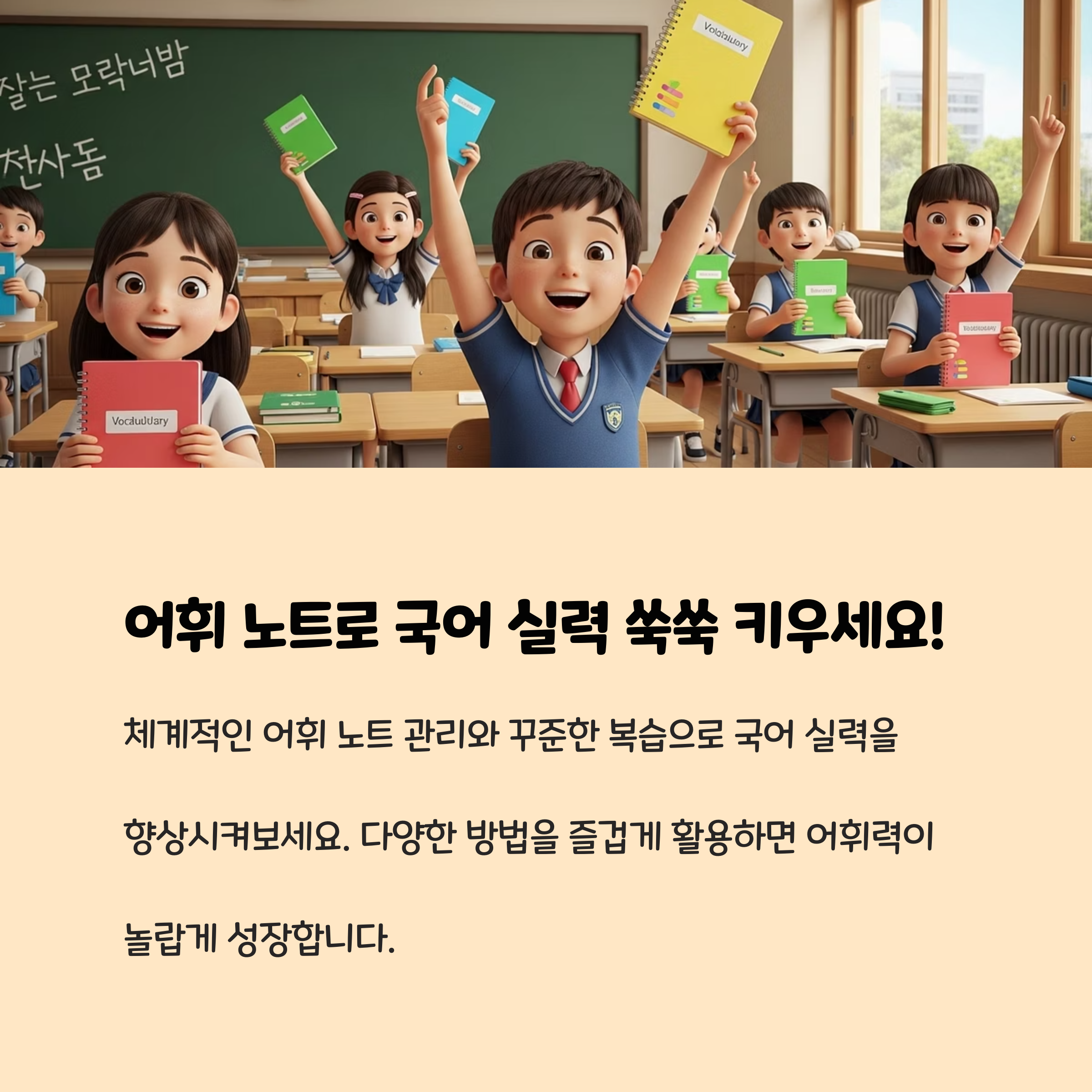 어휘 노트 정리는 단순한 암기를 넘어, 단어의 의미를 깊이 이해하고 실제로 활용할 수 있게 도와줍니다. 꾸준히 실천하면 국어뿐 아니라 모든 학습의 자신감이 커집니다.