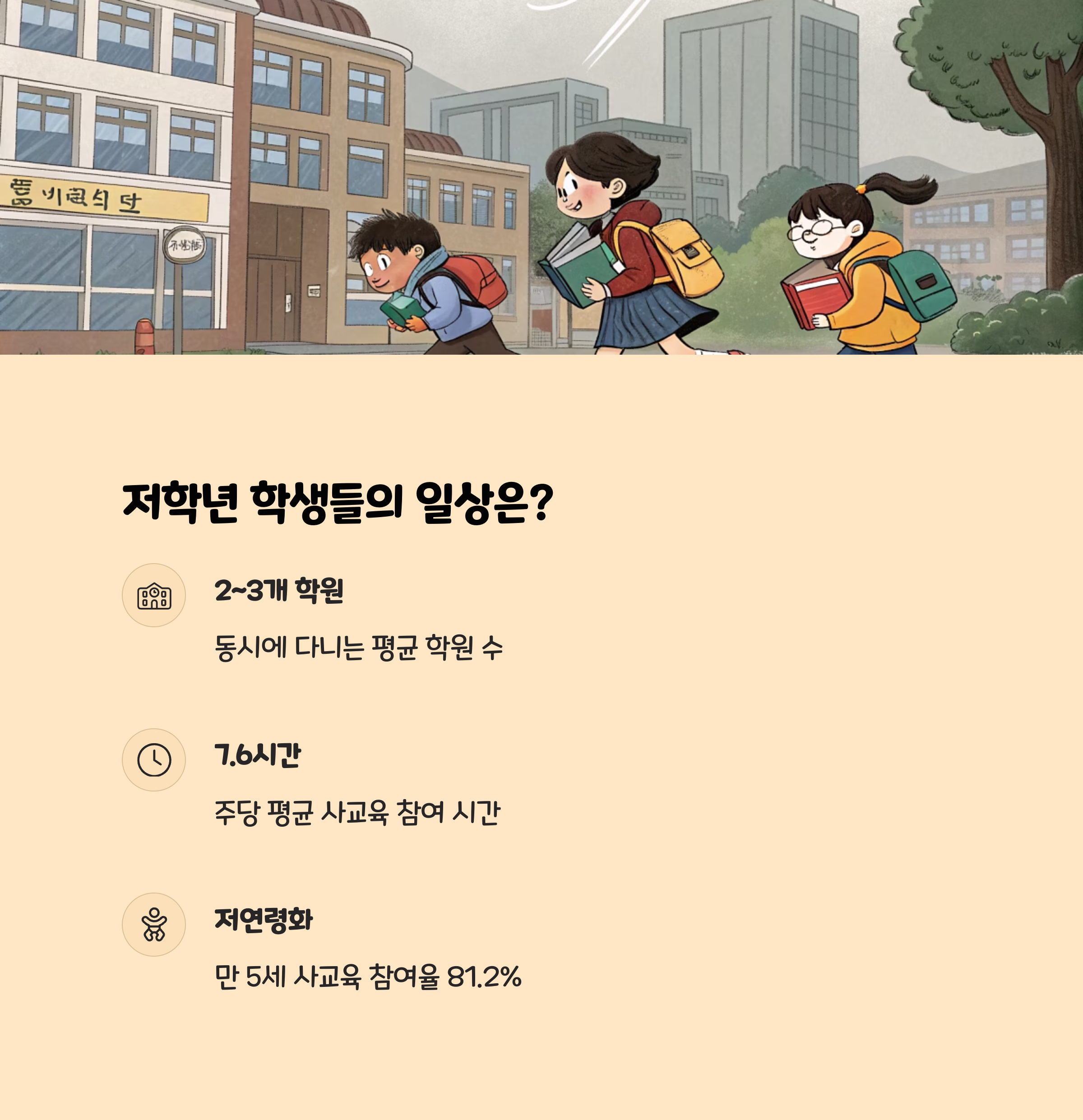 - 의대 정원 확대, 조기 선행학습 열풍이 맞물리면서, 초등 저학년부터 영어, 수학, 심지어 코딩·과학 학원까지 다니는 경우가 많아졌습니다.