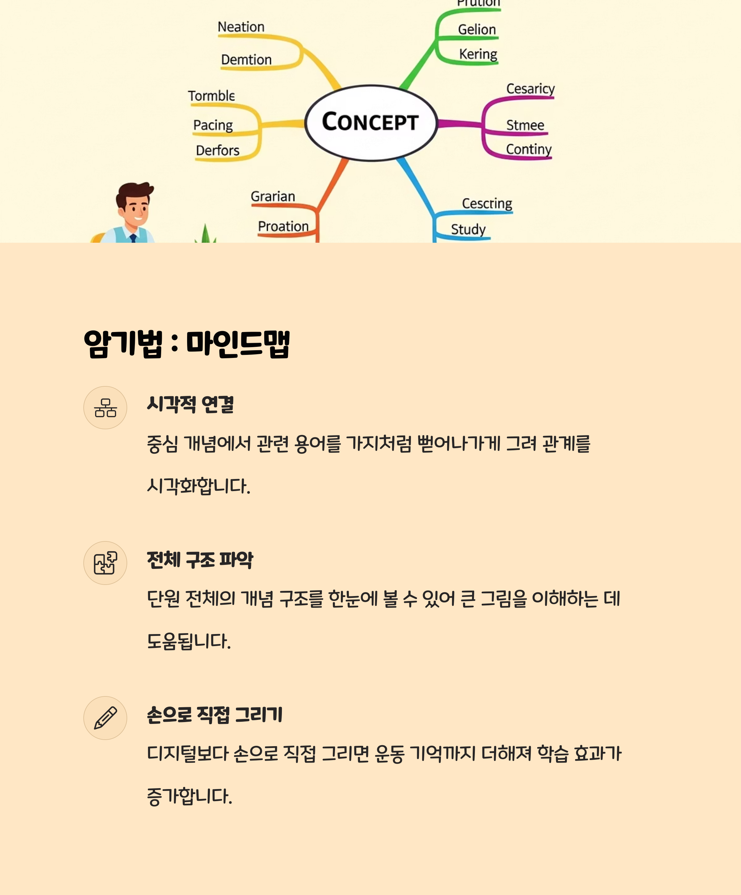 연상법 활용: 어려운 용어는 익숙한 이미지나 이야기에 연결해 외워보세요. 예를 들어, 태양계 행성 순서를 문장으로 만들어 암기하면 훨씬 쉽습니다.