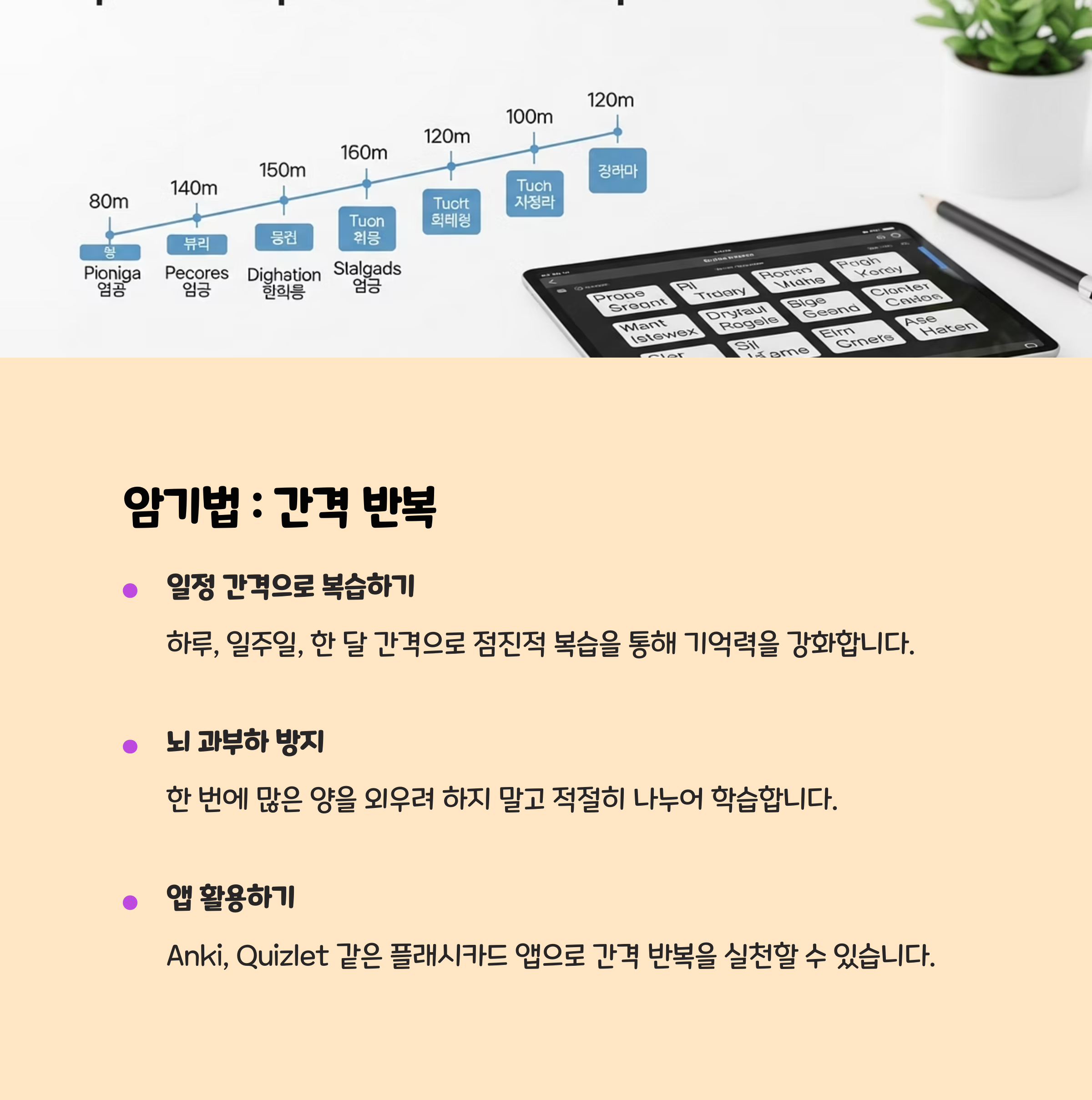 간격 반복 학습법: 한 번에 몰아서 외우는 것보다, 일정한 간격(예: 당일, 하루 뒤, 일주일 뒤)에 복습하면 장기 기억에 훨씬 효과적입니다.