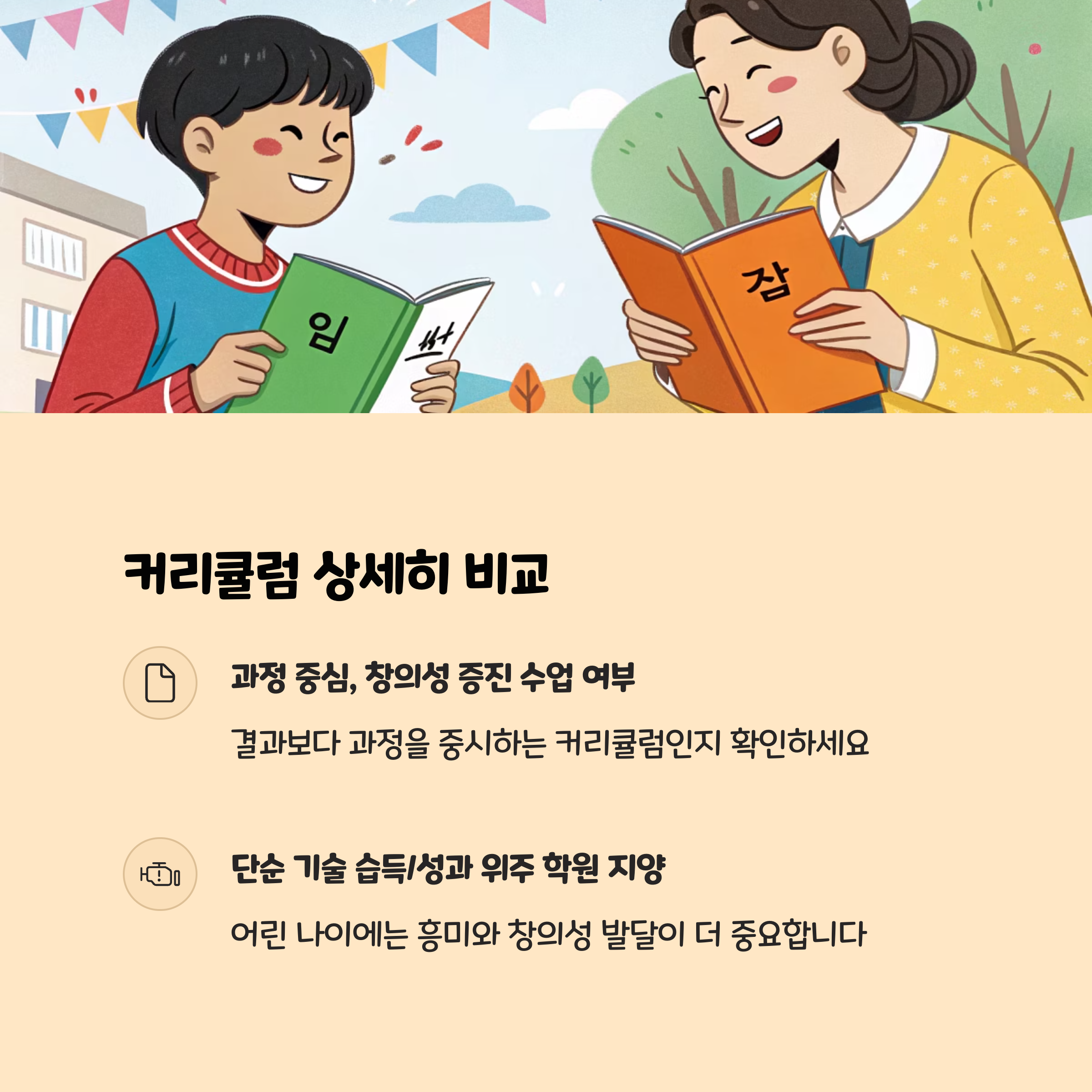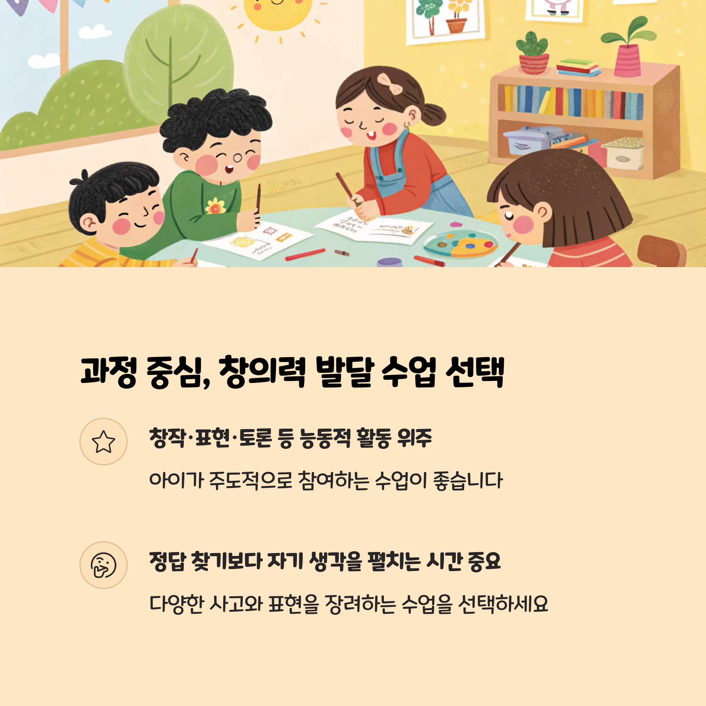- 과정 중심의 커리큘럼과 창의성·사회성 발달에 중점을 두세요.