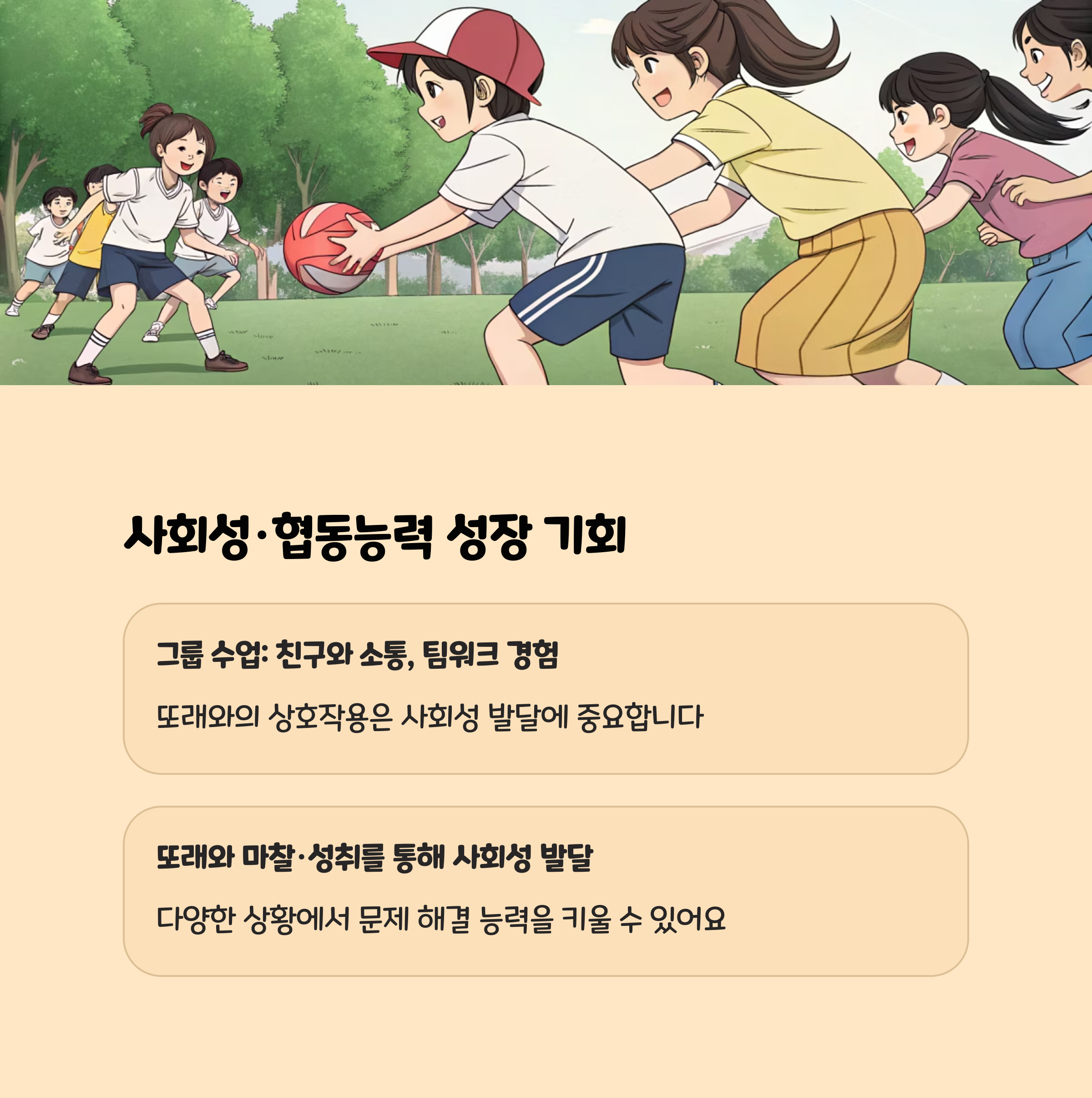 | 체육 | 안전관리, 맞춤형 지도, 체력·사회성 발달, 시설 확인 | “친절한 지도, 체육 후 집중력·협동심 향상, 적응 빠름” |