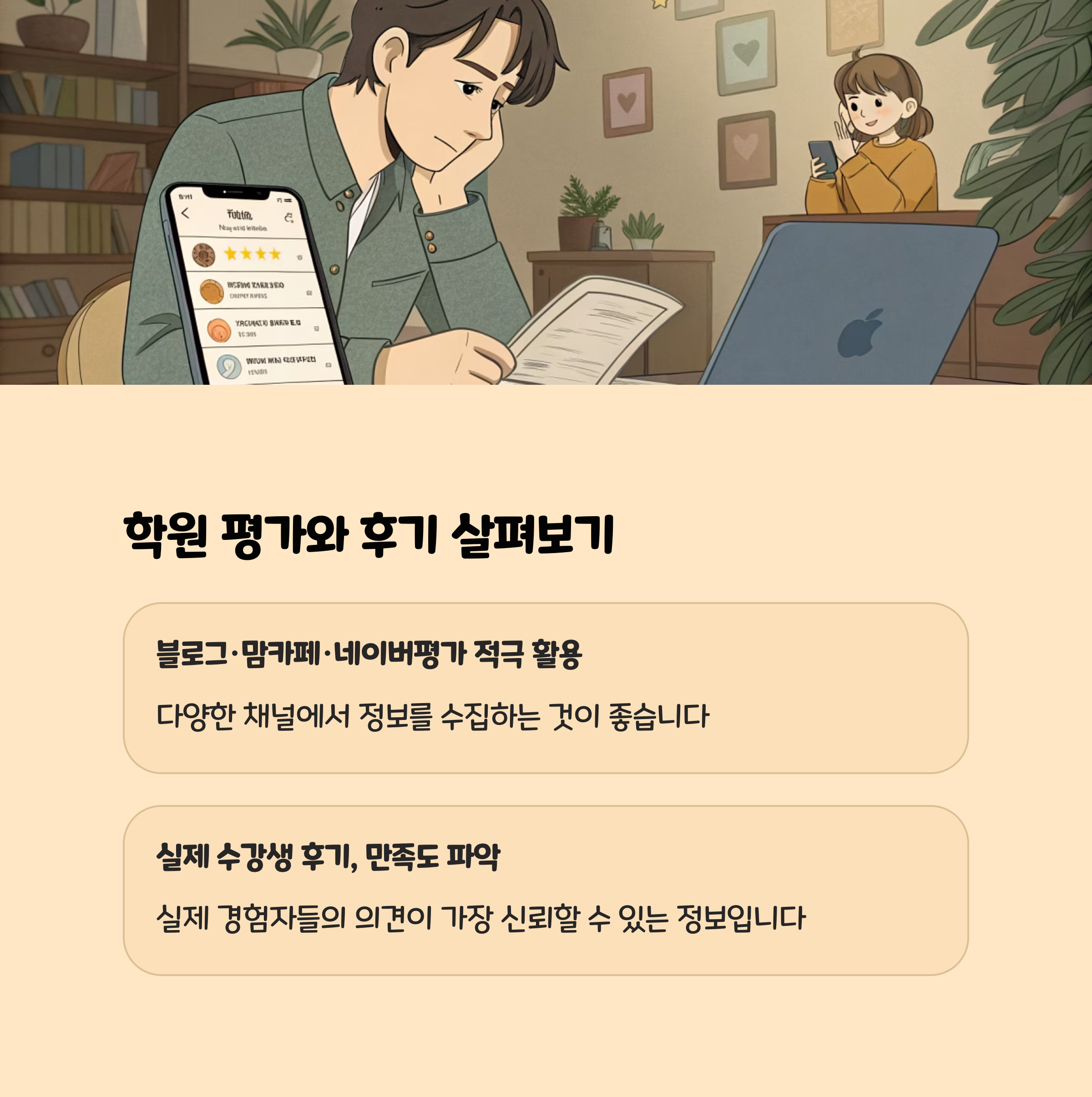 - 직접 방문 상담과 체험 수업을 통해 학원 환경과 강사진을 꼼꼼히 체크하세요.