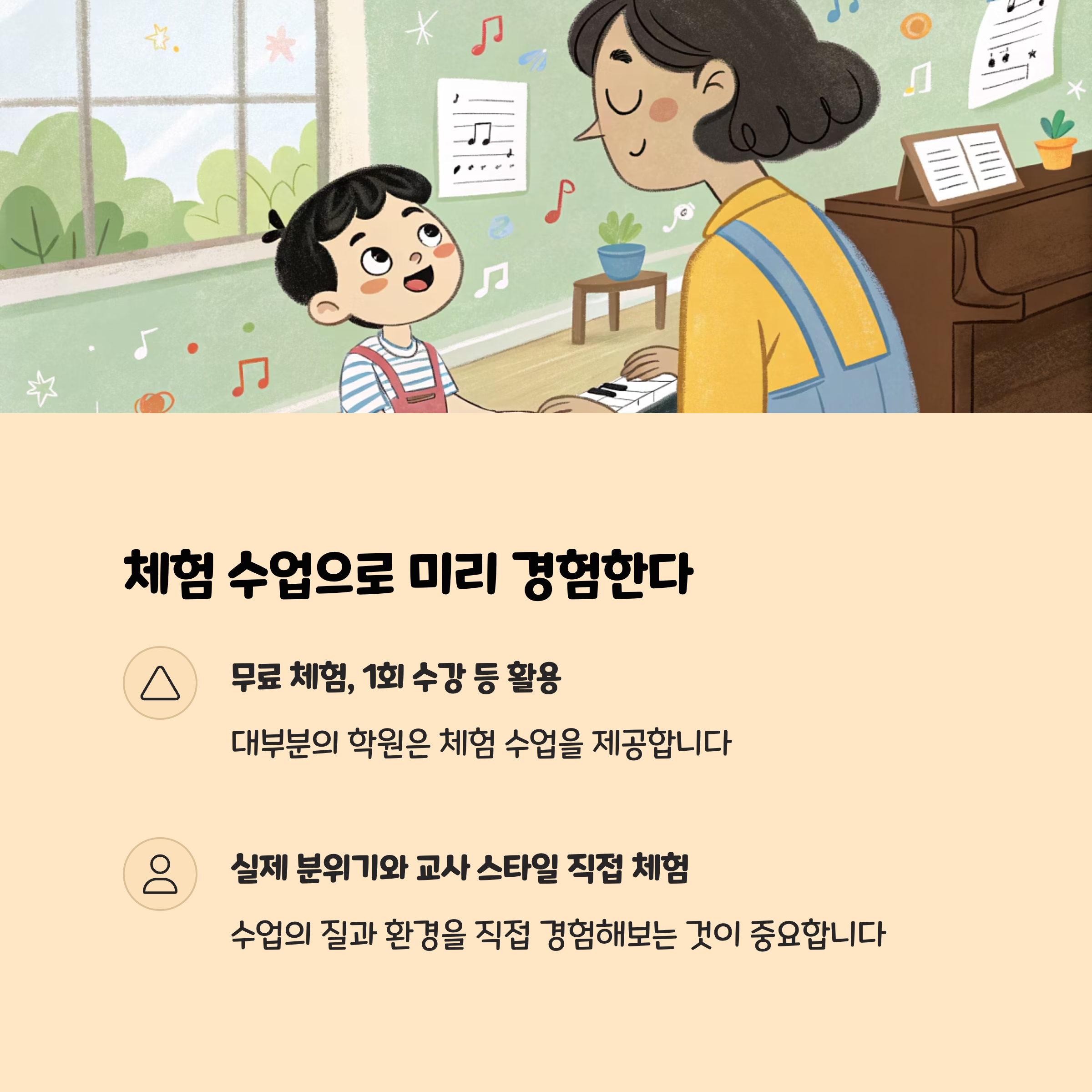 피아노 학원은 1:1 또는 소수 정예 수업, 미술 학원은 다양한 재료와 창의적 표현 중심, 체육 학원은 안전과 맞춤형 지도 여부를 꼼꼼히 살피세요.