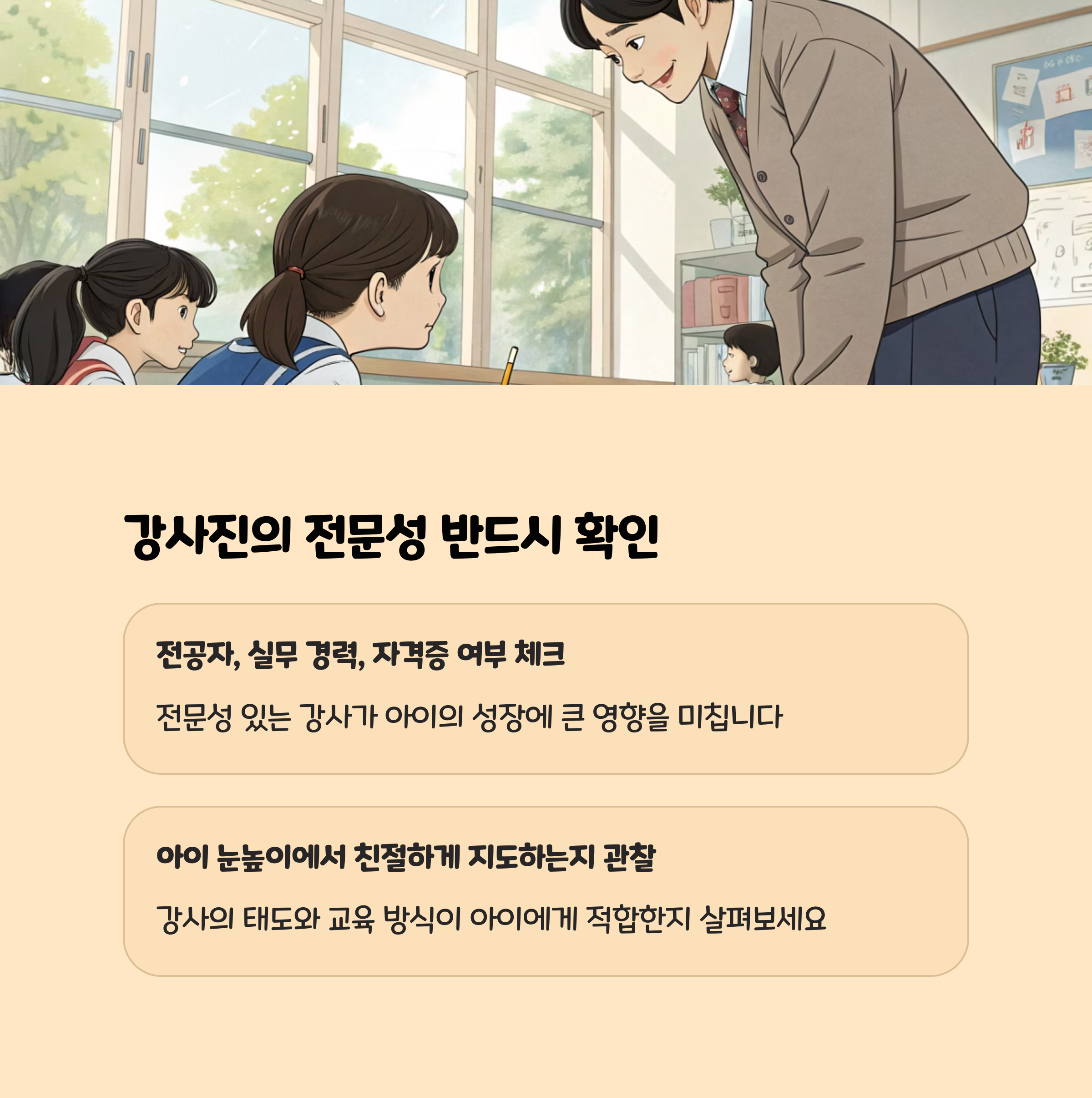 강사의 공식 자격증, 관련 전공 이력, 경력, 이전 학부모의 후기 등을 통해 강사의 전문성을 확인할 수 있습니다. 학원 홈페이지나 상담 시 강사의 이력서를 요청해보는 것도 방법입니다. 실제 수업을 참관하거나 체험 수업을 통해 강사의 지도 방식과 아이와의 소통 능력을 직접 확인하는 것이 중요합니다.