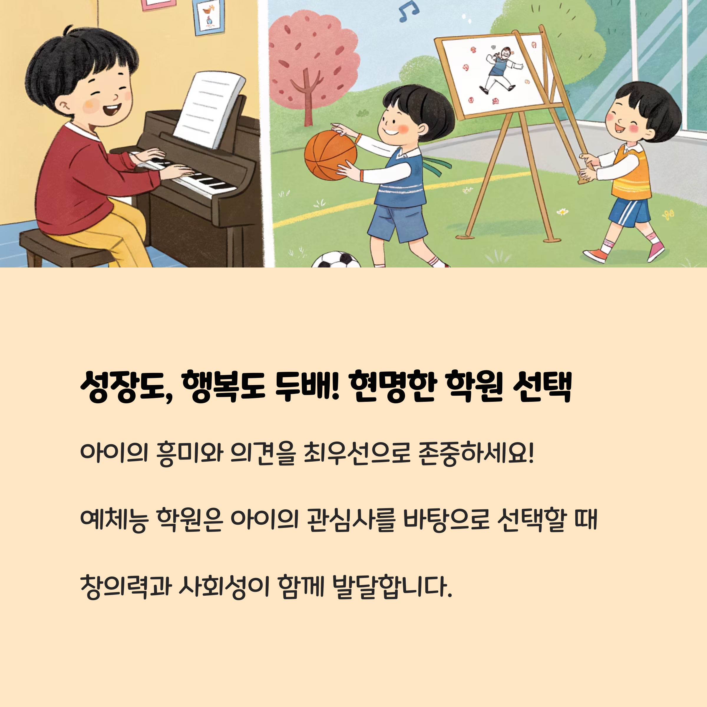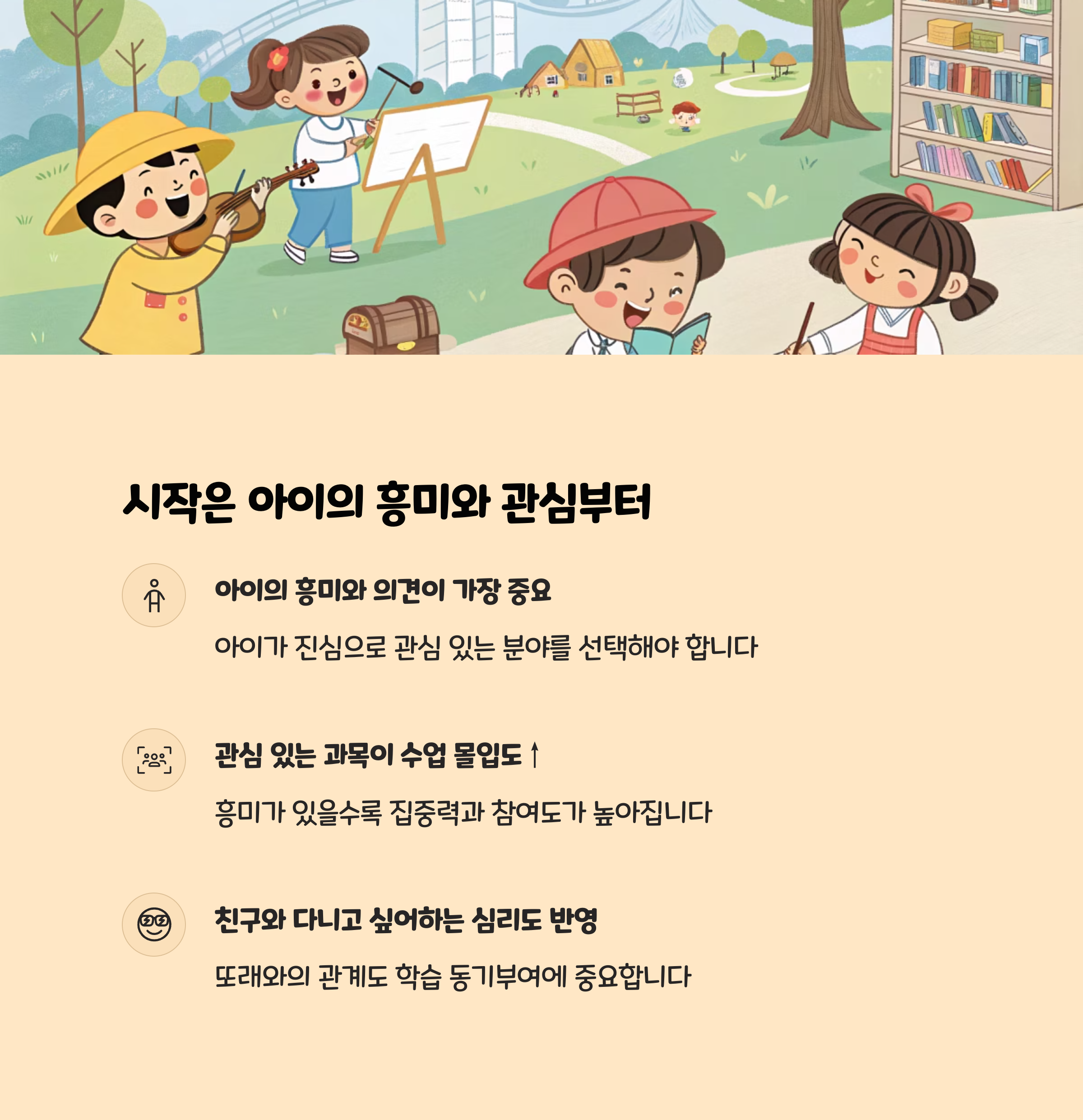 전문가들은 “아이의 의견을 반드시 반영해야 한다”고 강조합니다. 학부모의 바람보다 아이가 진심으로 원하는 분야를 선택해야 오랫동안 즐겁게 다닐 수 있습니다.