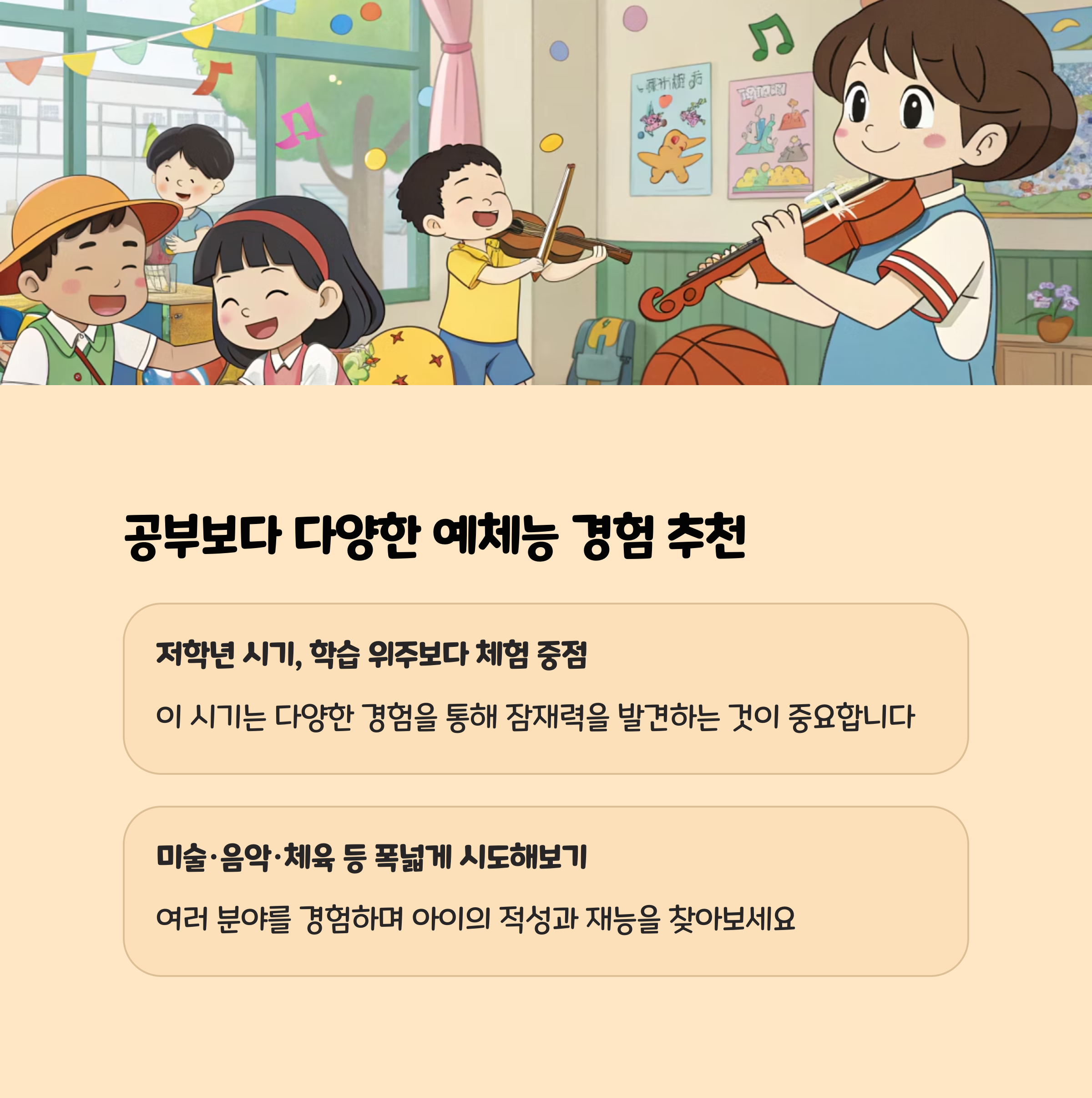 초등 1~2학년 시기에는 다양한 예체능 경험을 권장하지만, 4학년 이후에는 학업과의 균형을 고려해 선택과 집중이 필요합니다. 전문가들은 “예체능 학원은 적어도 2년 이상 꾸준히 다녔을 때 긍정적인 효과가 크다”고 조언합니다.