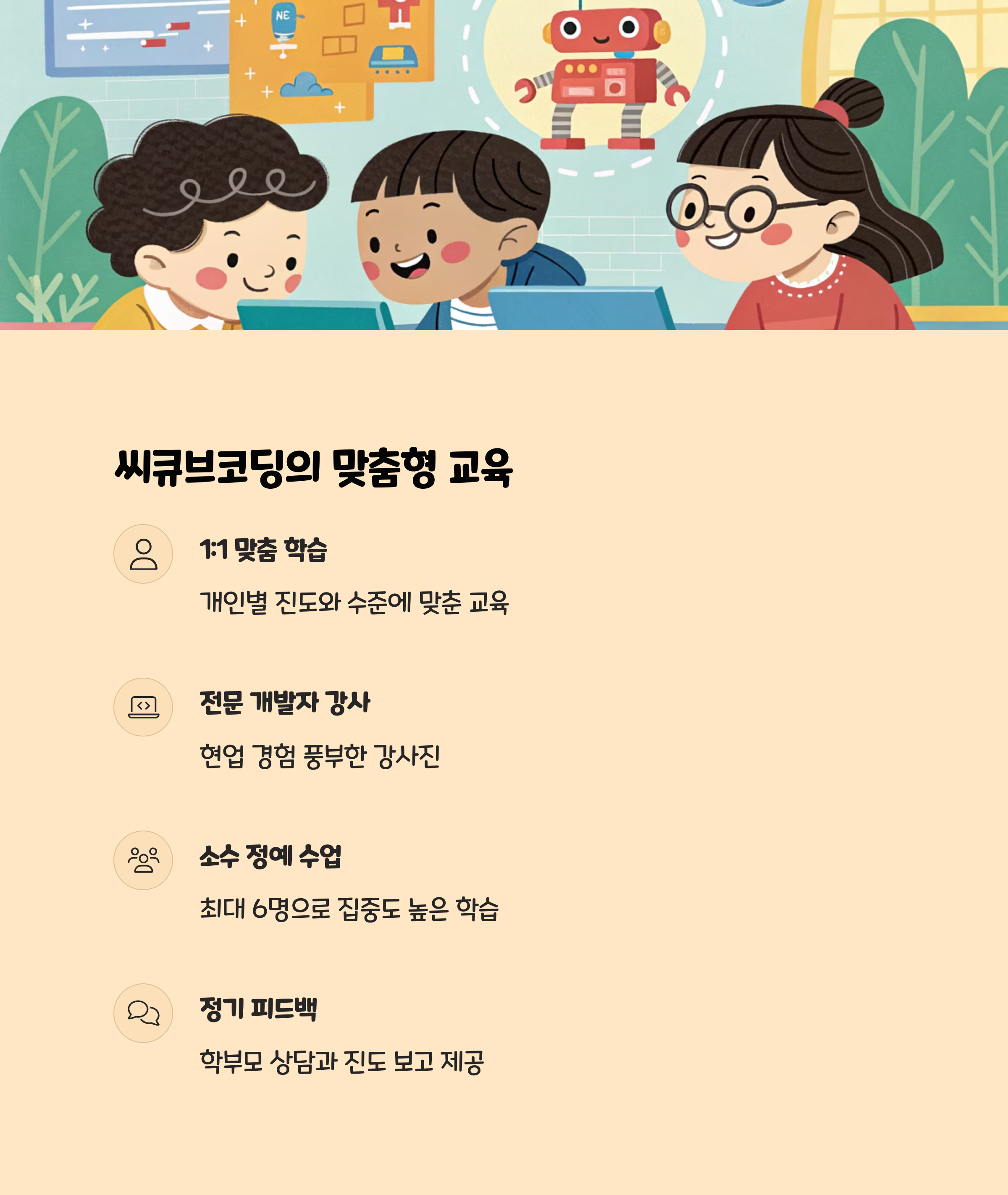 | 씨큐브코딩 | 1:1 체험수업, 컴퓨터공학 전공 강사진, 입시·진로 연계 |