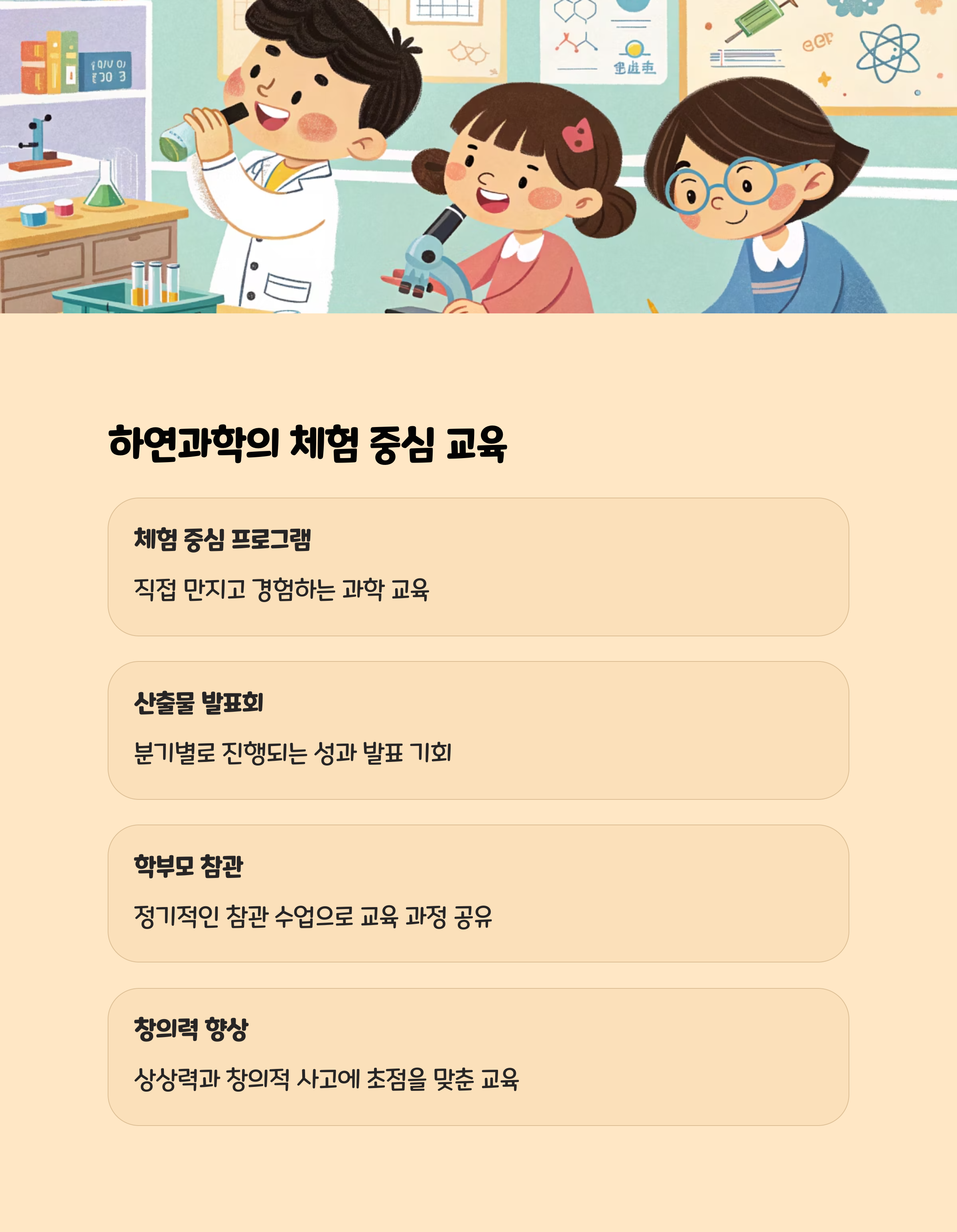 | 하연과학 | 8단계 체계화, 주 2회 실험, 소수 정예, 저렴한 수강료 |