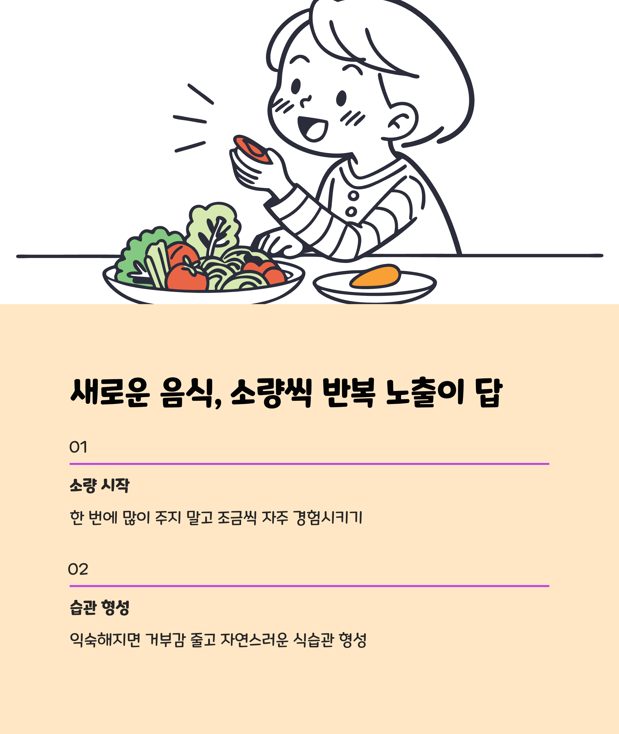 • 반복 노출: 새로운 음식은 최소 10~15회 다양한 조리법으로 소량씩 제공해 친숙해지도록 해야 합니다.