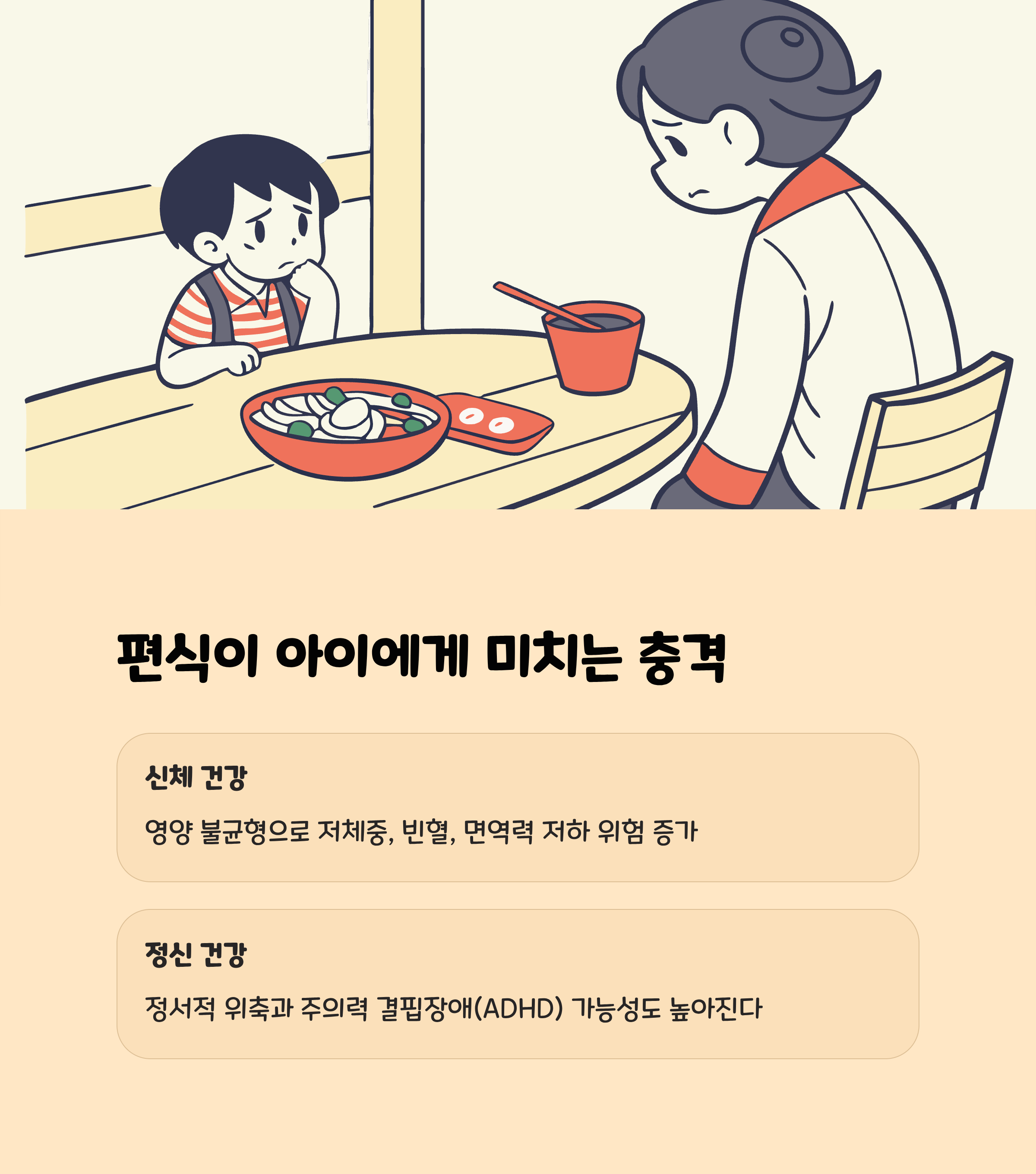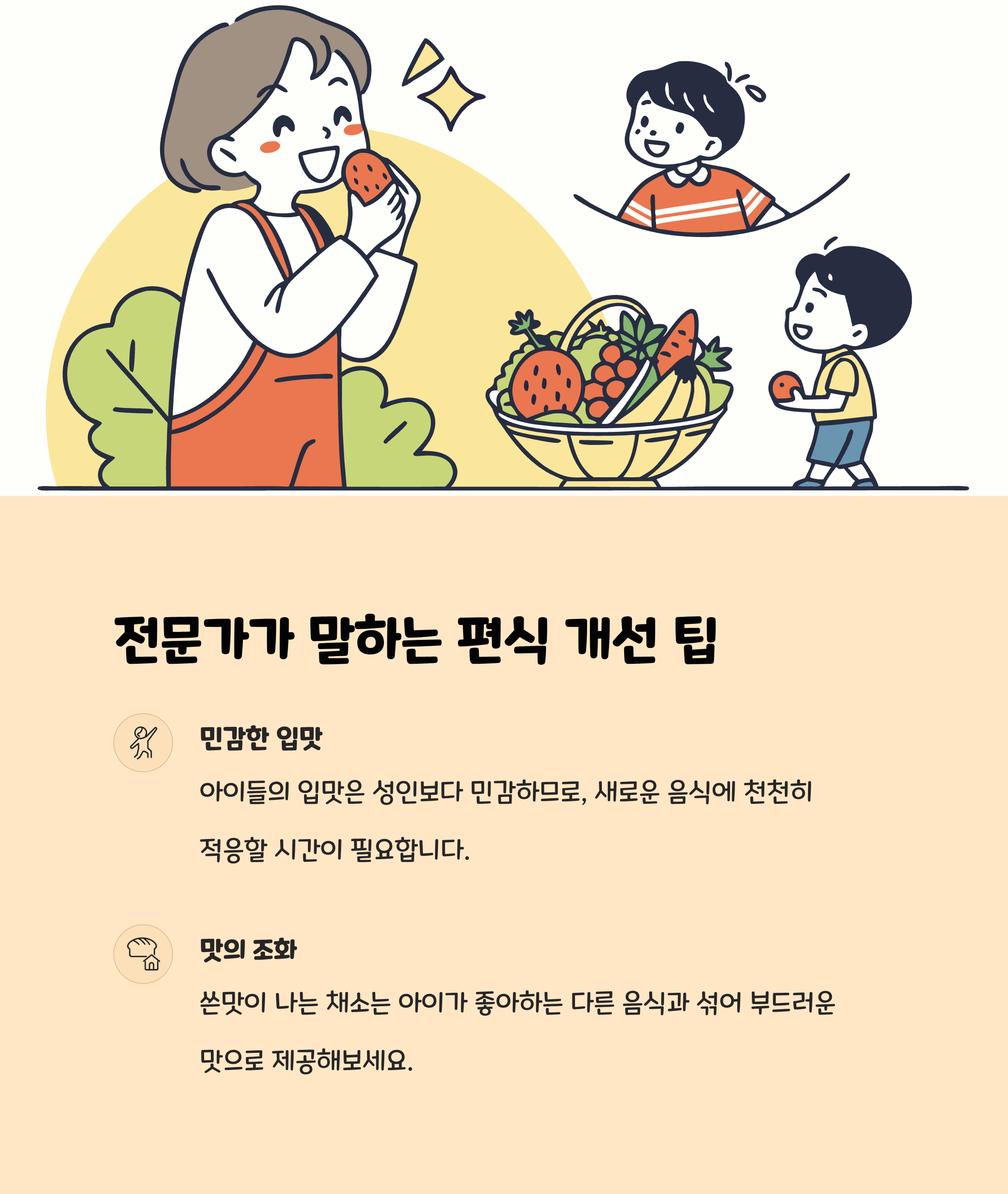 • 편식은 특정 음식만 좋아하고 일부 음식은 거부하는 식습관으로, 영양 불균형과 성장 지연, 면역력 저하를 초래할 수 있습니다.