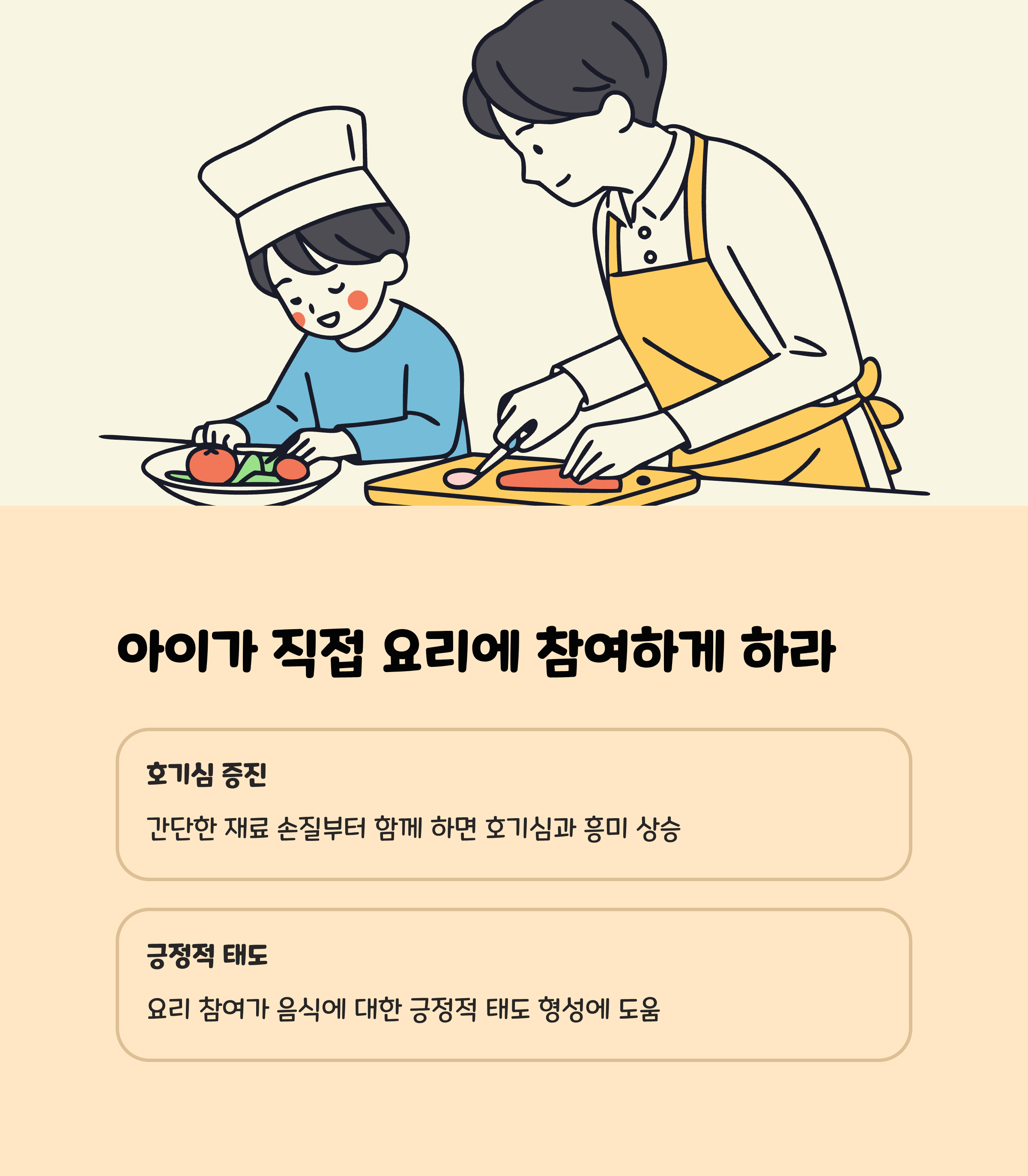 • 자율성 존중: 식사 준비와 음식 선택에 아이가 참여하게 하여 호기심과 흥미를 유발합니다.
