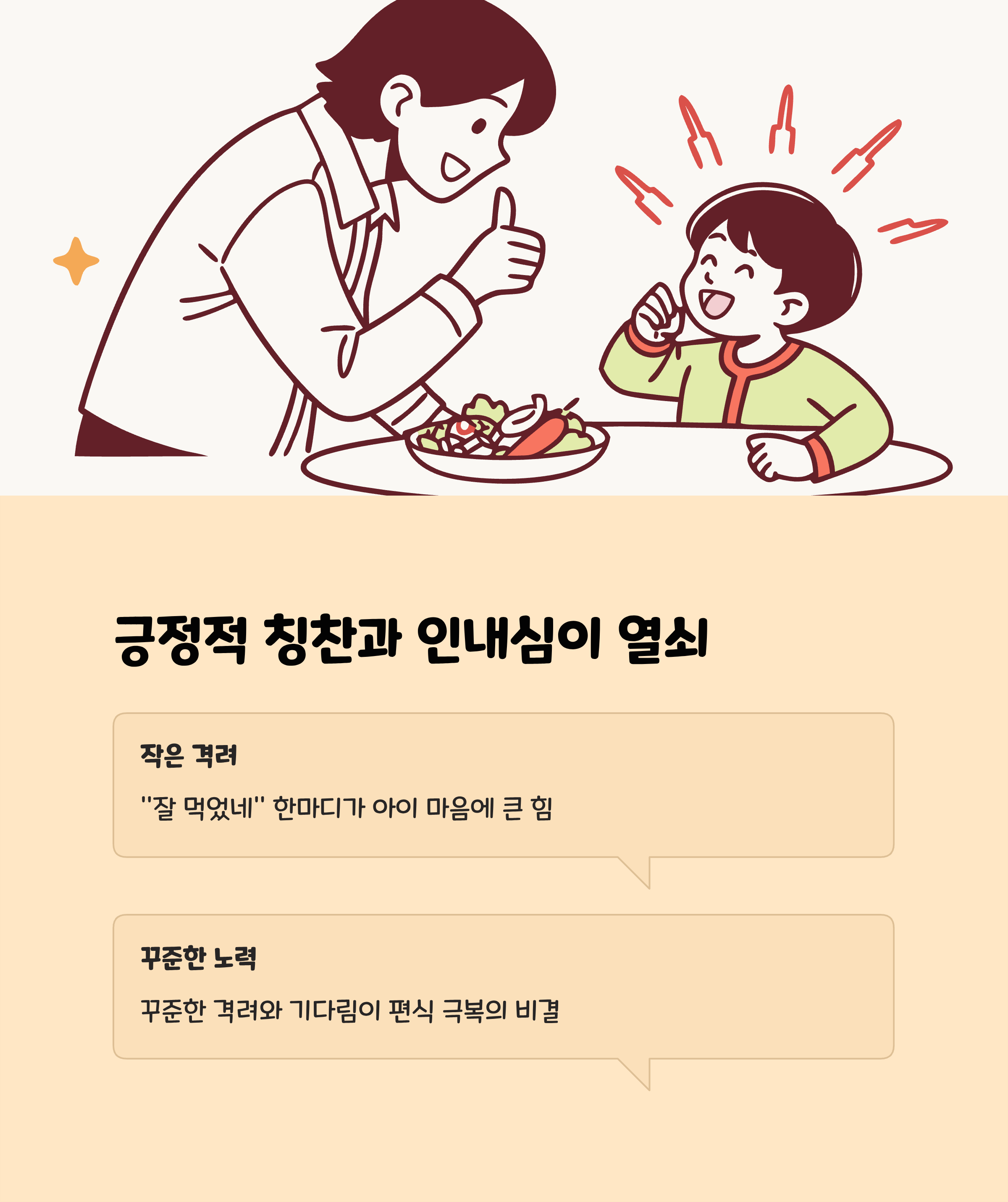 • 긍정적 경험 제공: 식사 시 즐거운 분위기를 만들고 아이가 음식을 탐색하게 하며 칭찬과 격려를 아끼지 않습니다.