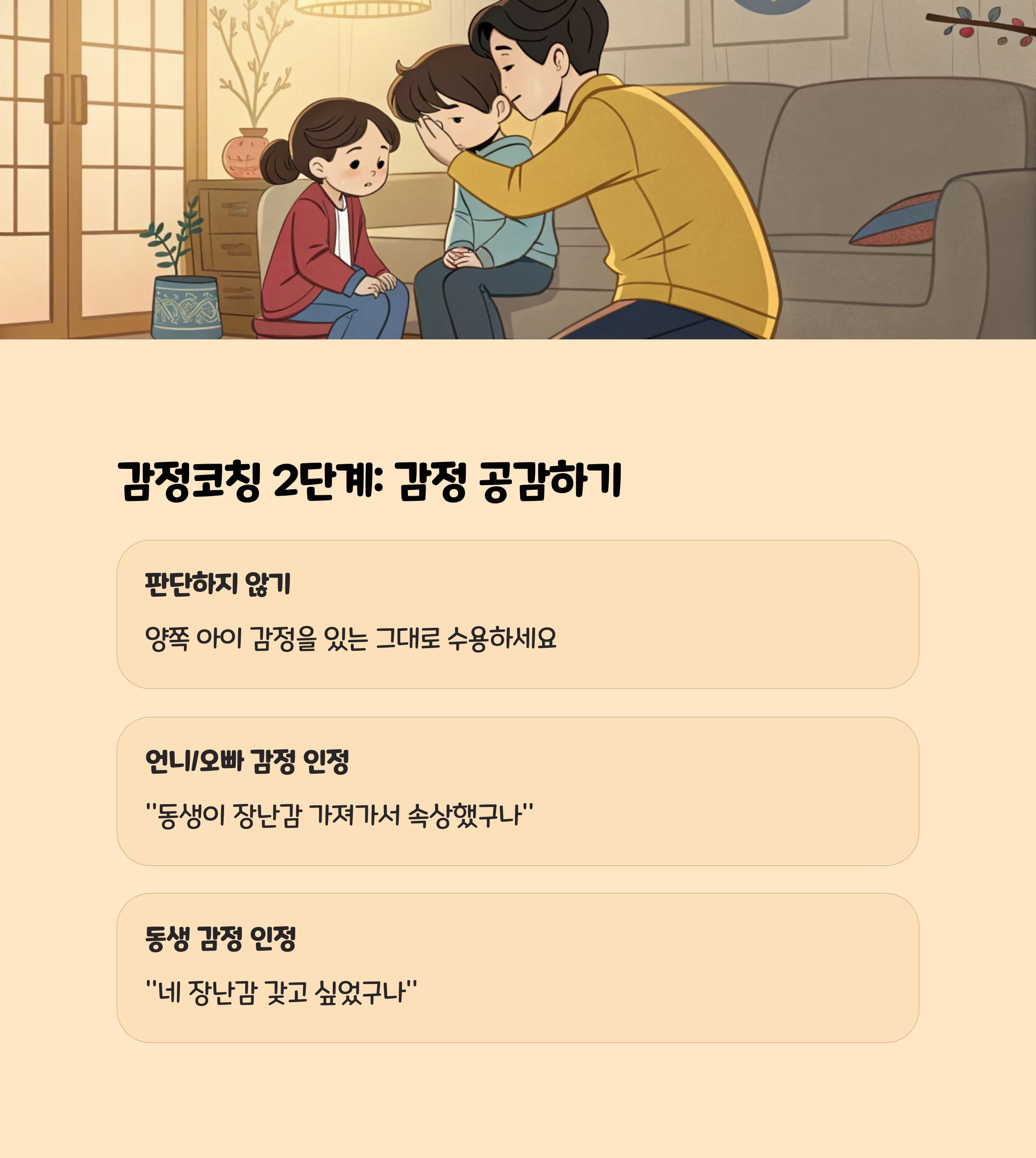일반적인 다툼은 아이들이 스스로 해결하도록 지켜보는 것이 좋지만, 신체적 위험이 있거나 감정적으로 매우 격해져 서로 상처를 줄 수 있는 상황에서는 부모가 즉시 개입해야 합니다. 이때도 감정코칭 대화법을 활용해 양쪽의 감정을 먼저 인정하고, 안전하게 상황을 정리하는 것이 중요합니다.