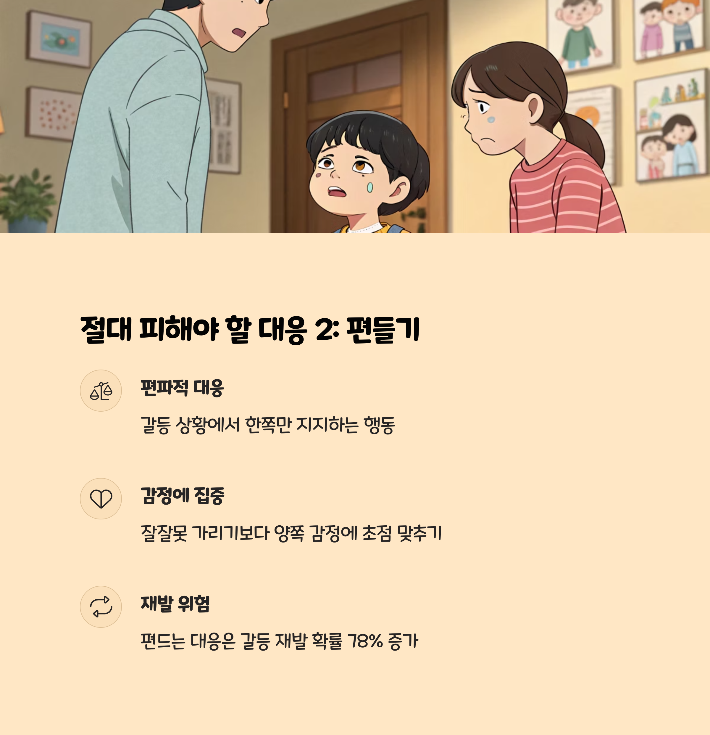- 편들지 않기: 한쪽만 편들면 다른 아이는 소외감을 느낍니다.