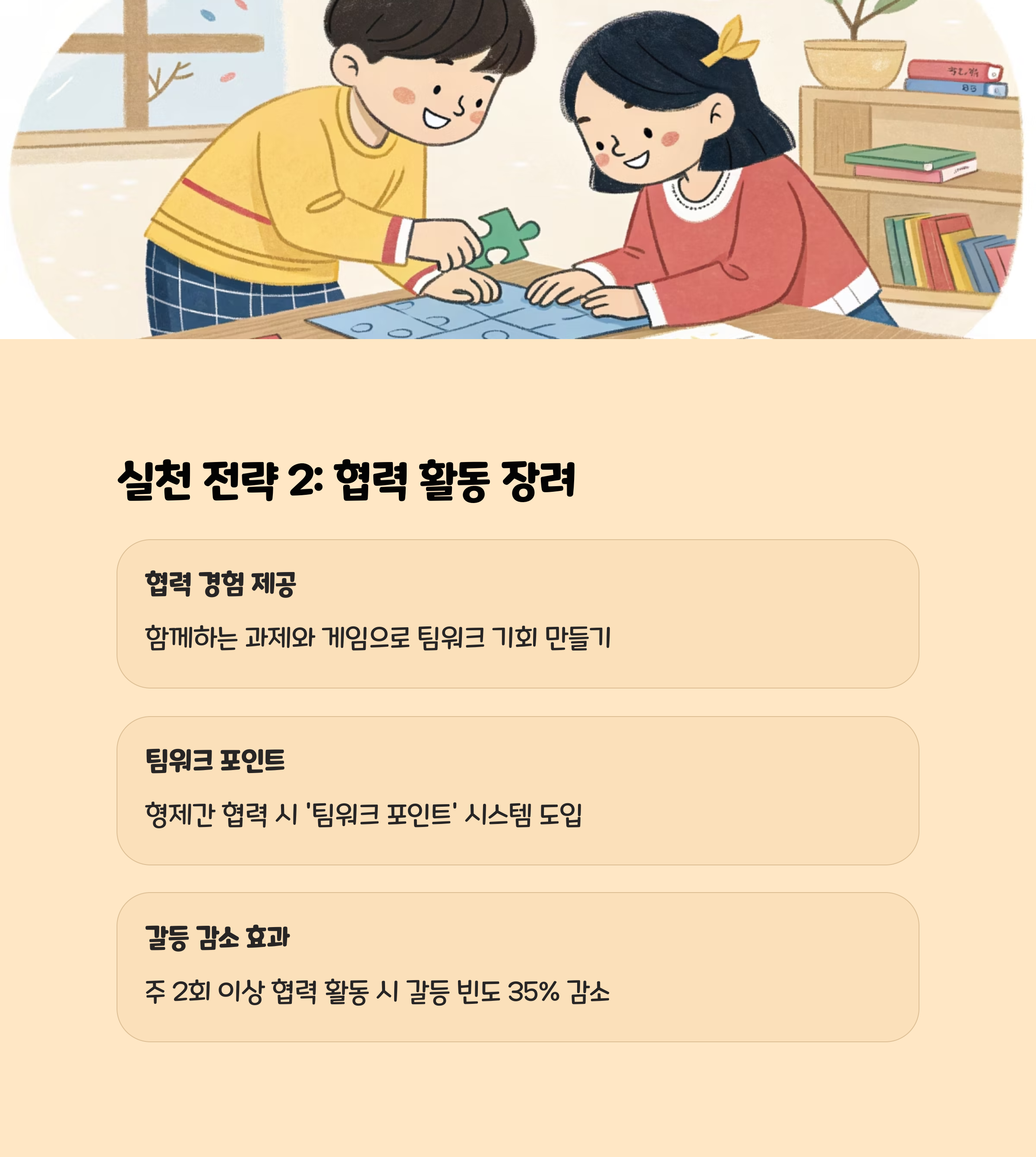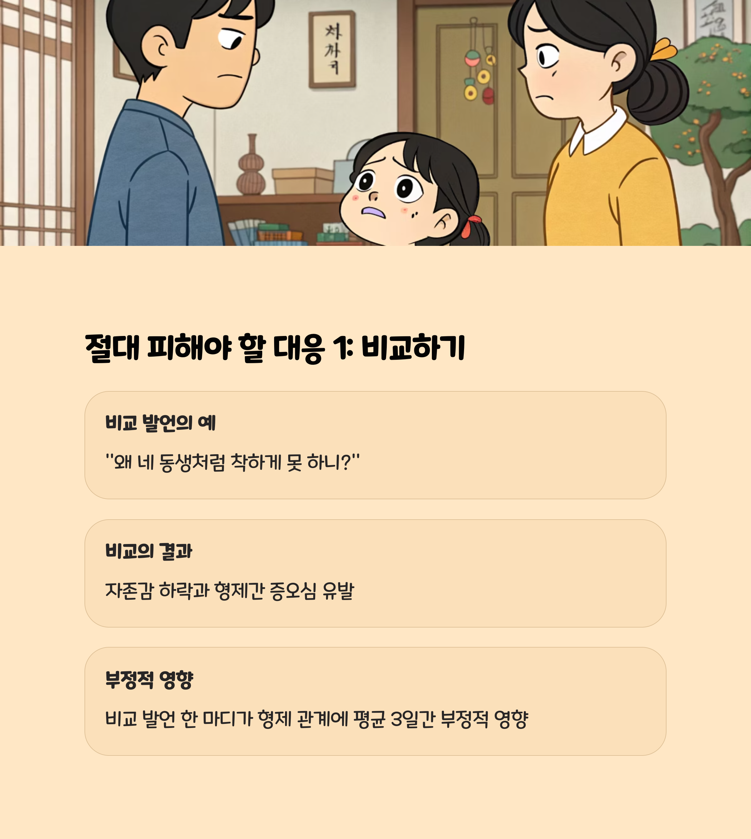 - 비교하지 않기: “형은 이렇게 잘하는데 너는 왜 못하니?”와 같은 말은 갈등을 악화시킵니다.