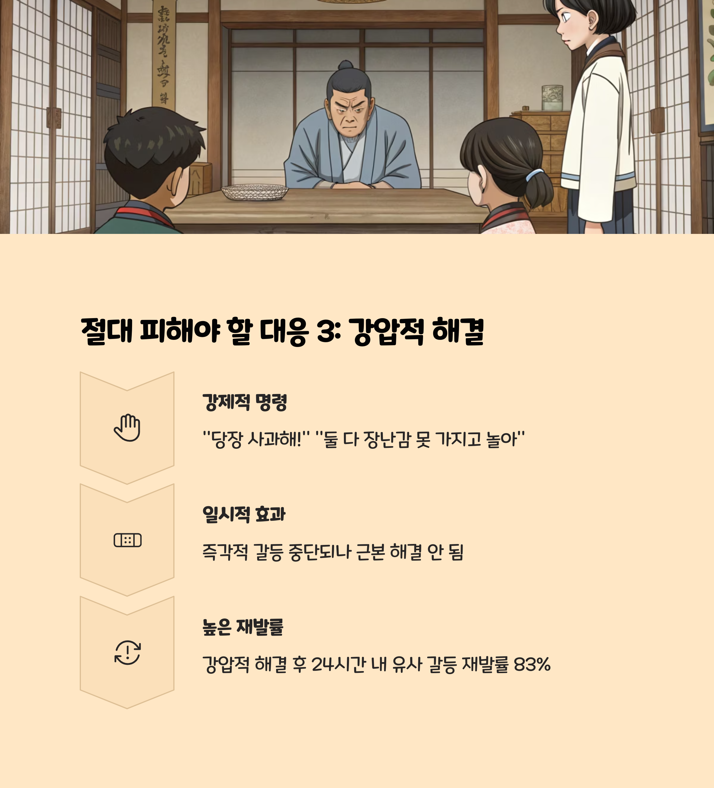 - 강압적 해결 금지: “둘 다 그만 싸워!”처럼 감정을 억누르는 태도는 문제 해결에 도움이 되지 않습니다.