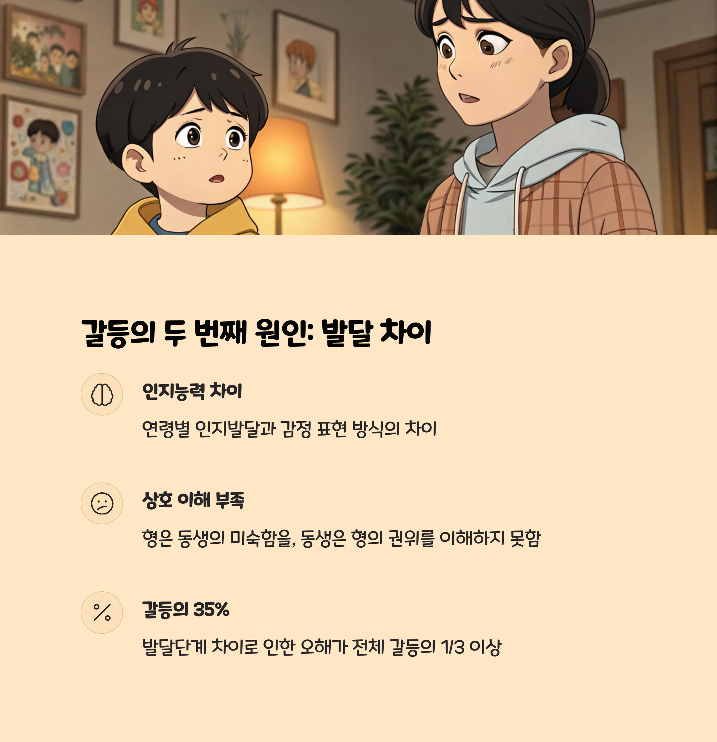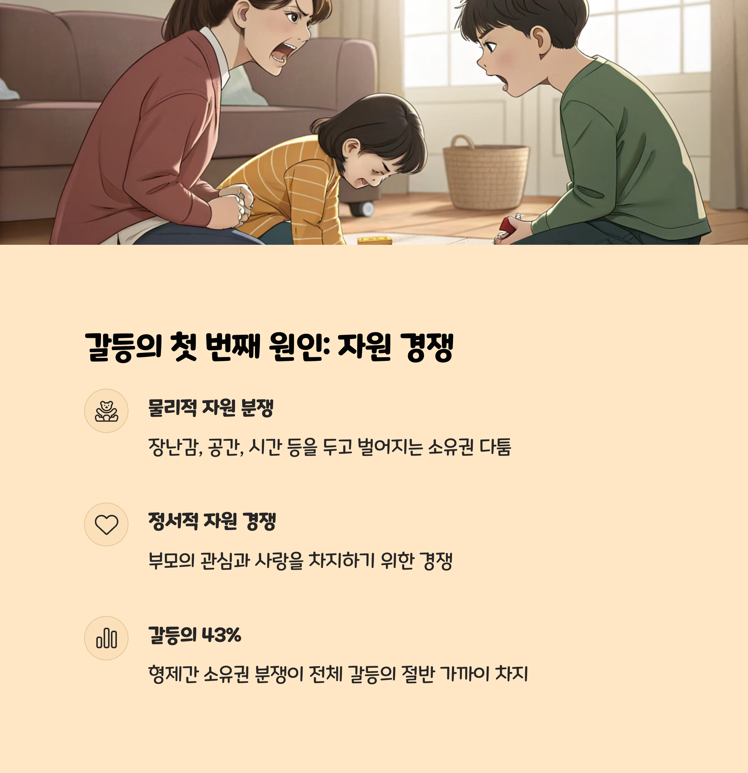 형제자매 갈등은 주로 부모의 관심을 더 받고 싶어 하는 경쟁심, 감정 표현의 미숙함, 부모의 무의식적 편애, 그리고 각자의 성격 차이에서 비롯됩니다. 또한 아이들이 자신의 감정을 제대로 표현하거나 조절하는 방법을 배우지 못한 경우, 사소한 오해나 욕구 충돌이 쉽게 다툼으로 이어질 수 있습니다. 부모가 갈등의 원인을 이해하고 중재하는 것이 중요합니다.