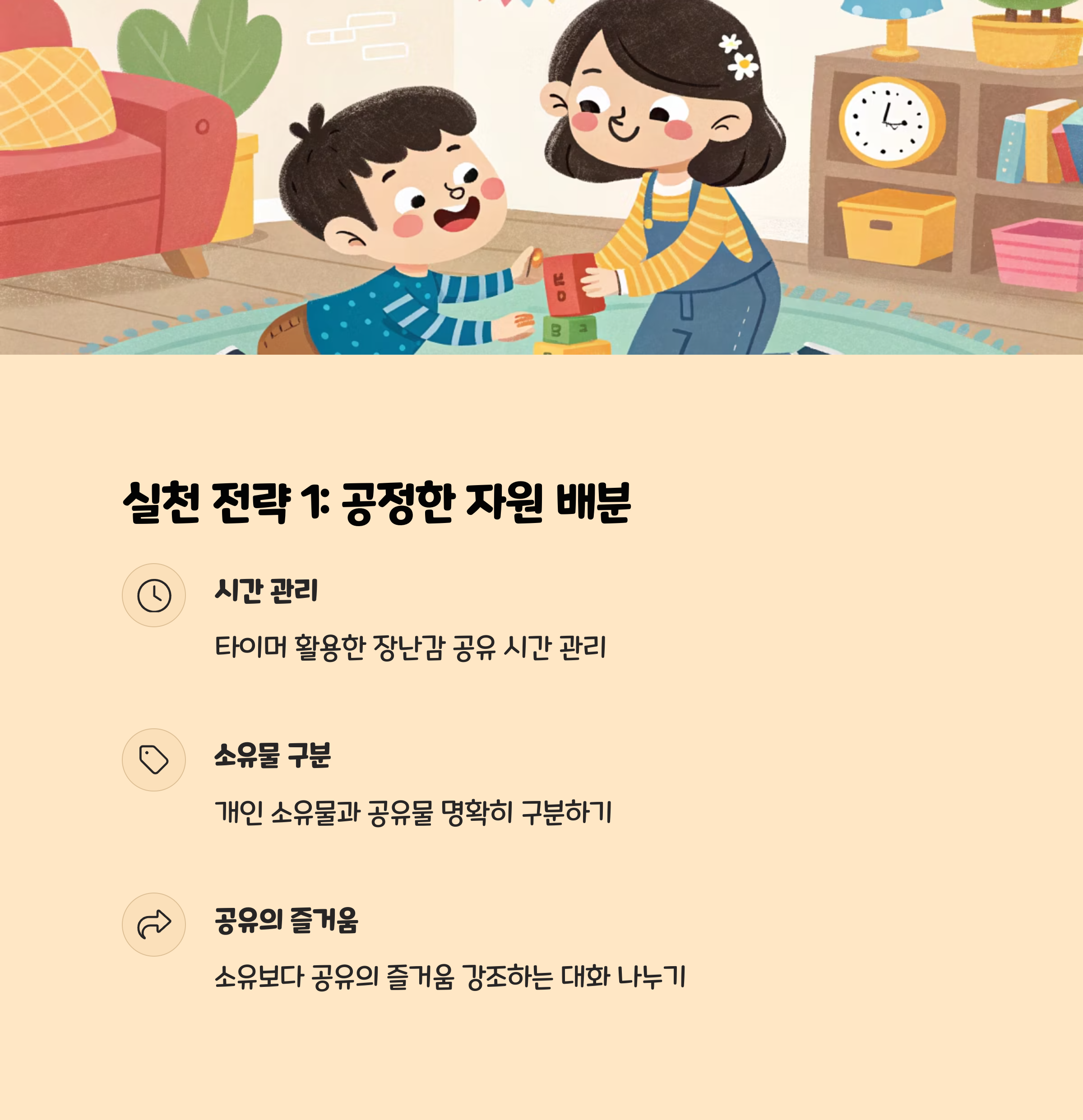 부모가 일방적으로 해결하지 말고, “둘 다 원하는 걸 얻으려면 어떻게 하면 좋을까?”와 같은 질문을 통해 아이들이 직접 대안을 찾게 도와주세요. 이는 협력과 타협의 경험을 쌓는 데 큰 도움이 됩니다.