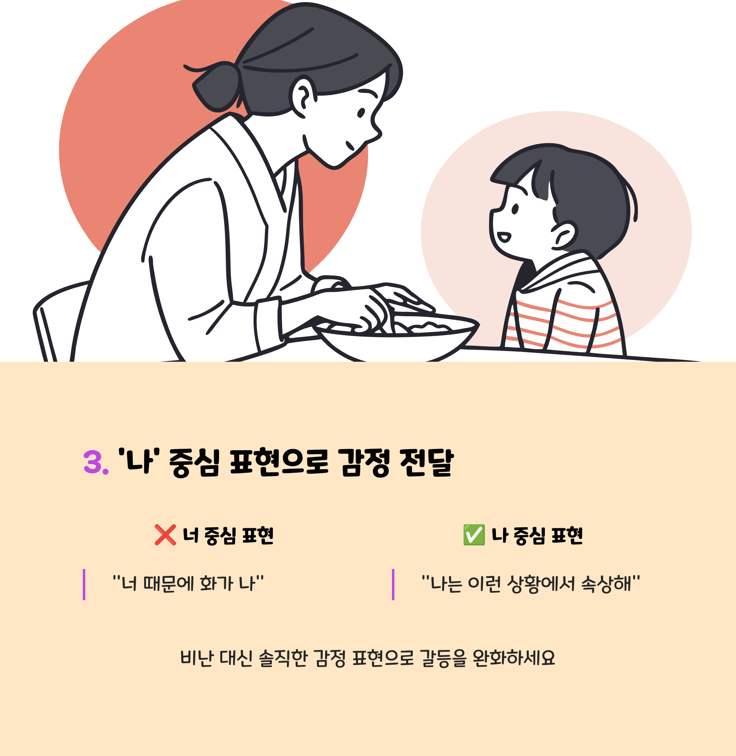 • “너는 왜 그래?” 대신 “나는 ~해서 힘들어”처럼 자신의 감정을 전달해 자녀의 책임과 이해를 돕습니다.
