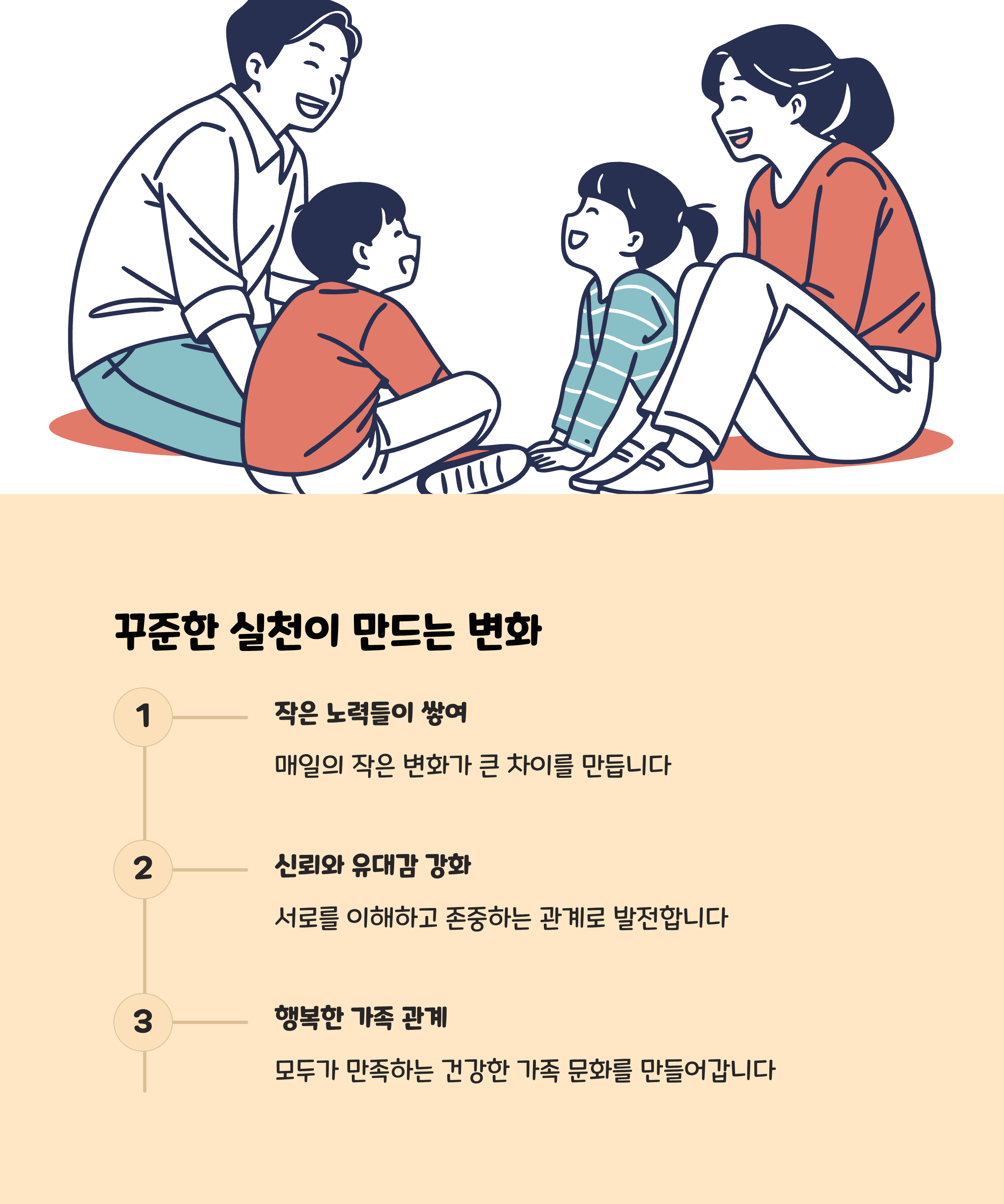 • 실행팁: 매일 최소 10분이라도 가족만의 대화 시간을 정해주면 관계가 강화되고 지속적인 소통의 즐거움을 경험하게 됩니다.