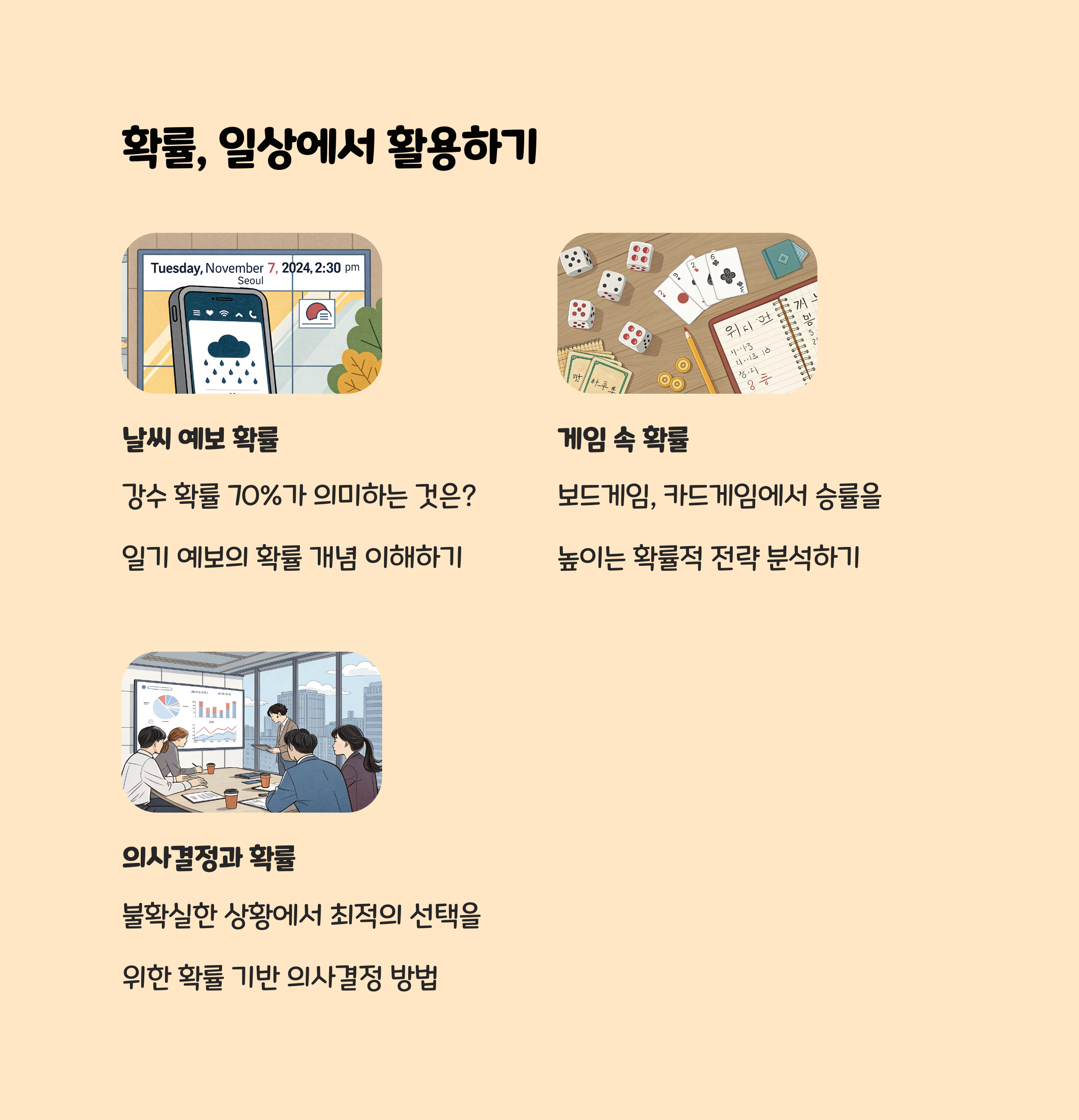 실생활과 관련된 수학 문제를 많이 접하고, 문제의 맥락과 조건을 분석하는 연습이 필요합니다. 예를 들어, 확률 단원에서는 복권, 게임, 보험 등 실제 사례를 활용해 사고력을 확장하고, 다양한 접근법을 시도해 보는 것이 중요합니다.