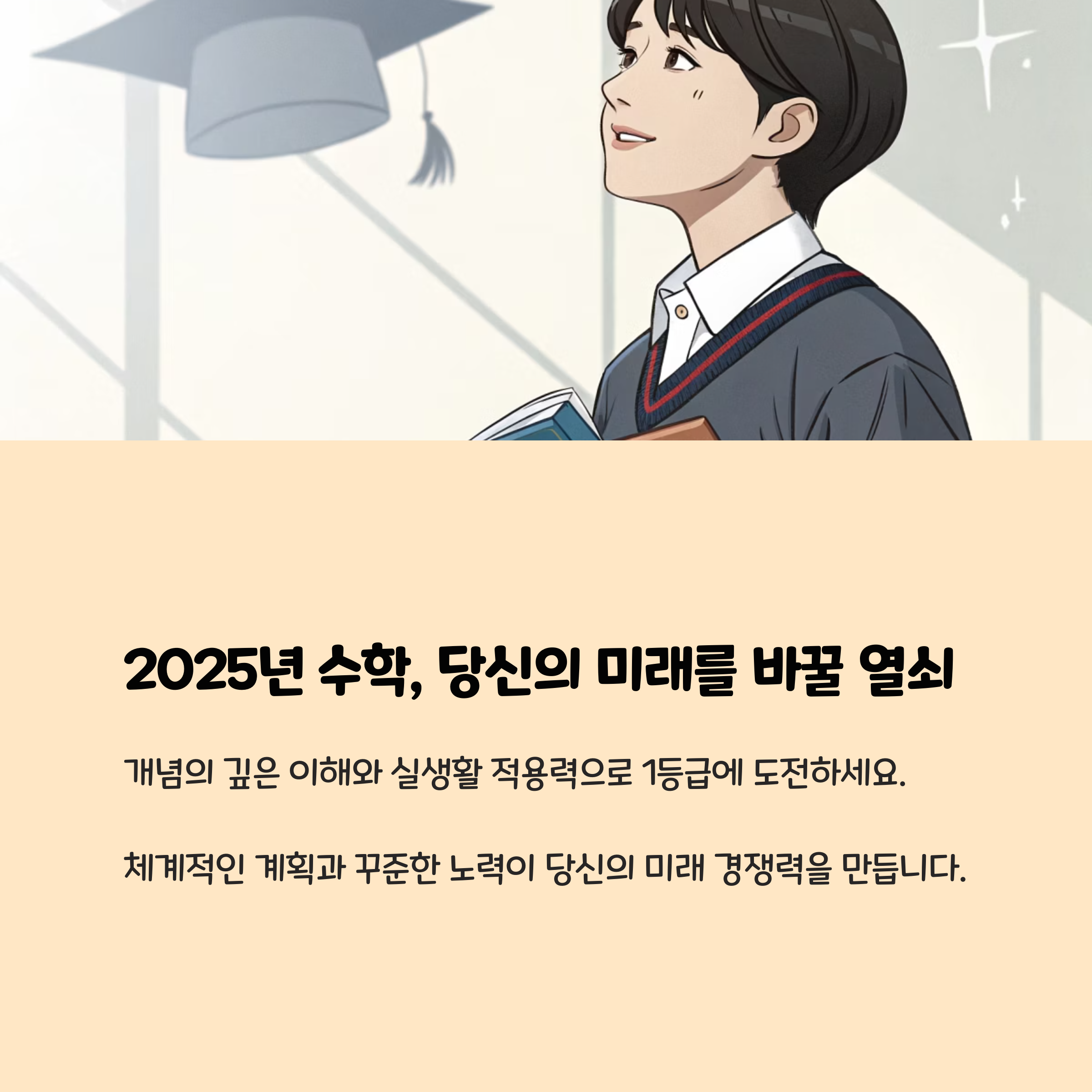 2025년 고1 수학은 개념의 체계적 이해와 실생활 적용력을 동시에 요구합니다. 기출문제집과 수능형 변형 문제를 적극 활용해 내신과 수능을 모두 대비하고, 각 단원의 개념을 실제 생활 문제와 연결해보세요. 논리적 사고력과 문제 해결력을 갖춘다면, 대학 입시뿐 아니라 미래 사회에서도 경쟁력을 갖출 수 있습니다.