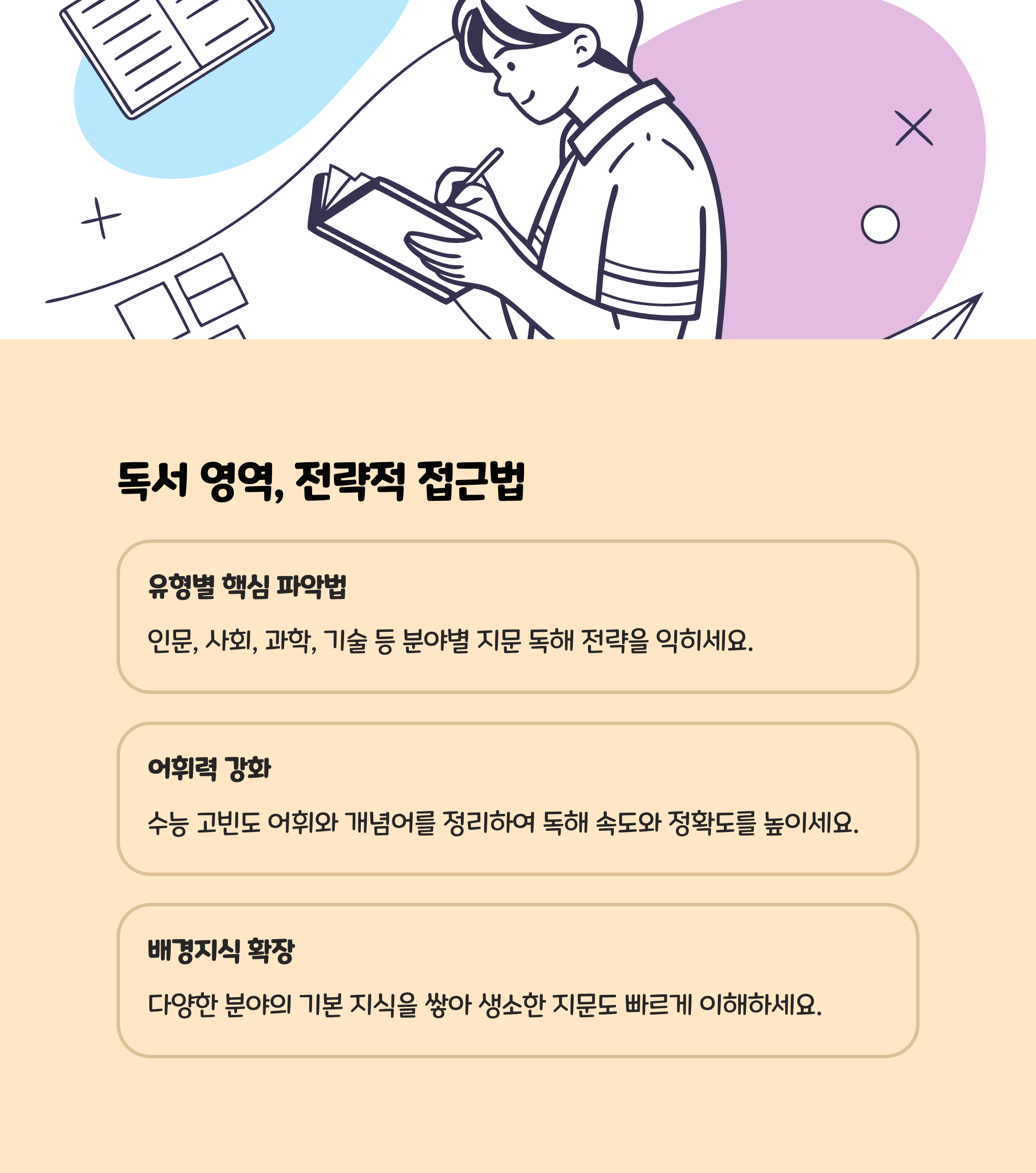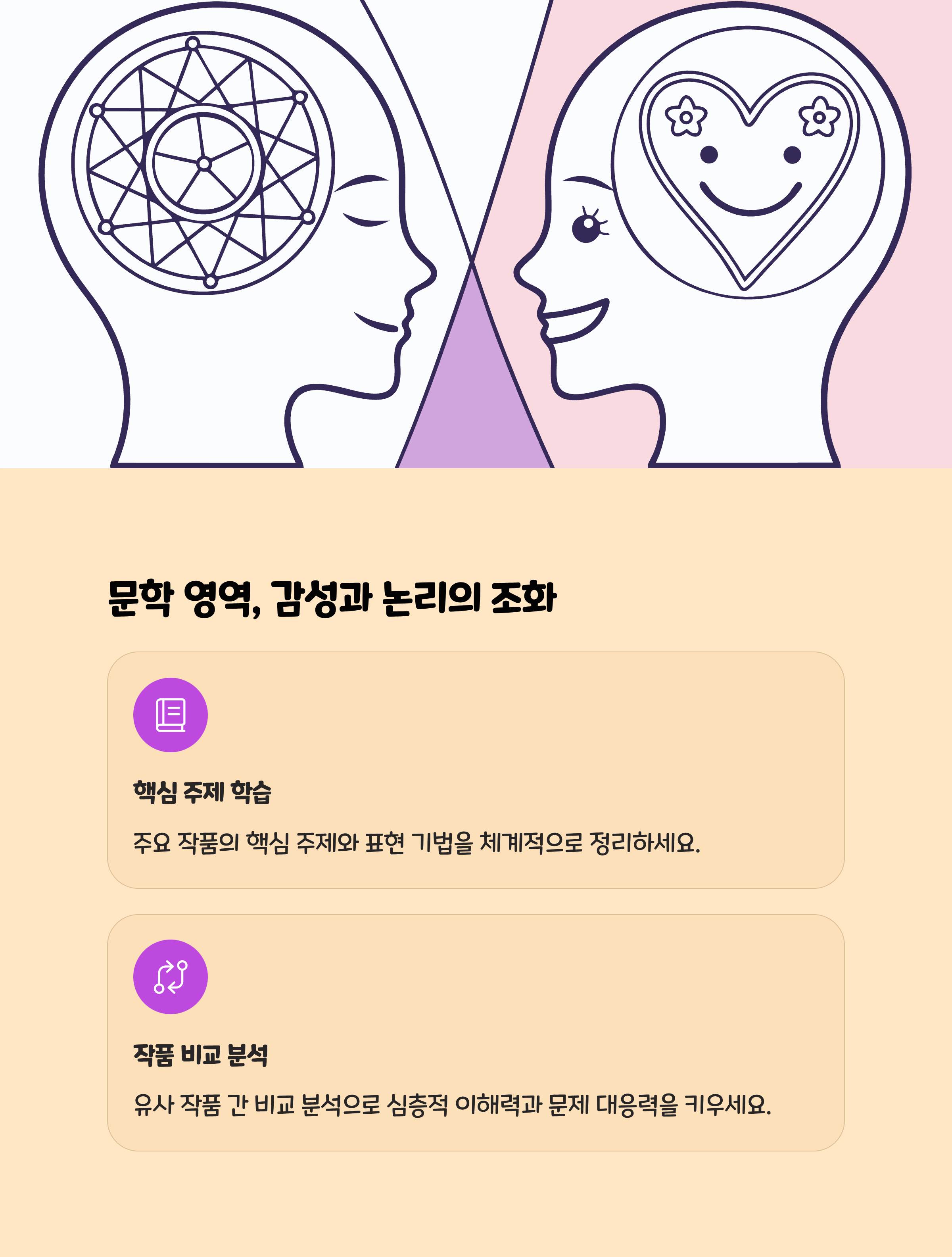 독서 영역은 꾸준한 지문 읽기와 함께 문제풀이 속도도 키워야 합니다. 하지만 여름방학 전까지는 속도보다 정확도에 집중해 꼼꼼한 이해를 바탕으로 문제를 푸는 연습을 권장합니다. 문학은 고전시가, 현대시, 갈래 복합 등 각 유형별 특징과 주제를 철저히 학습하고, 자주 출제되는 표현법과 구조 분석에 집중하세요.