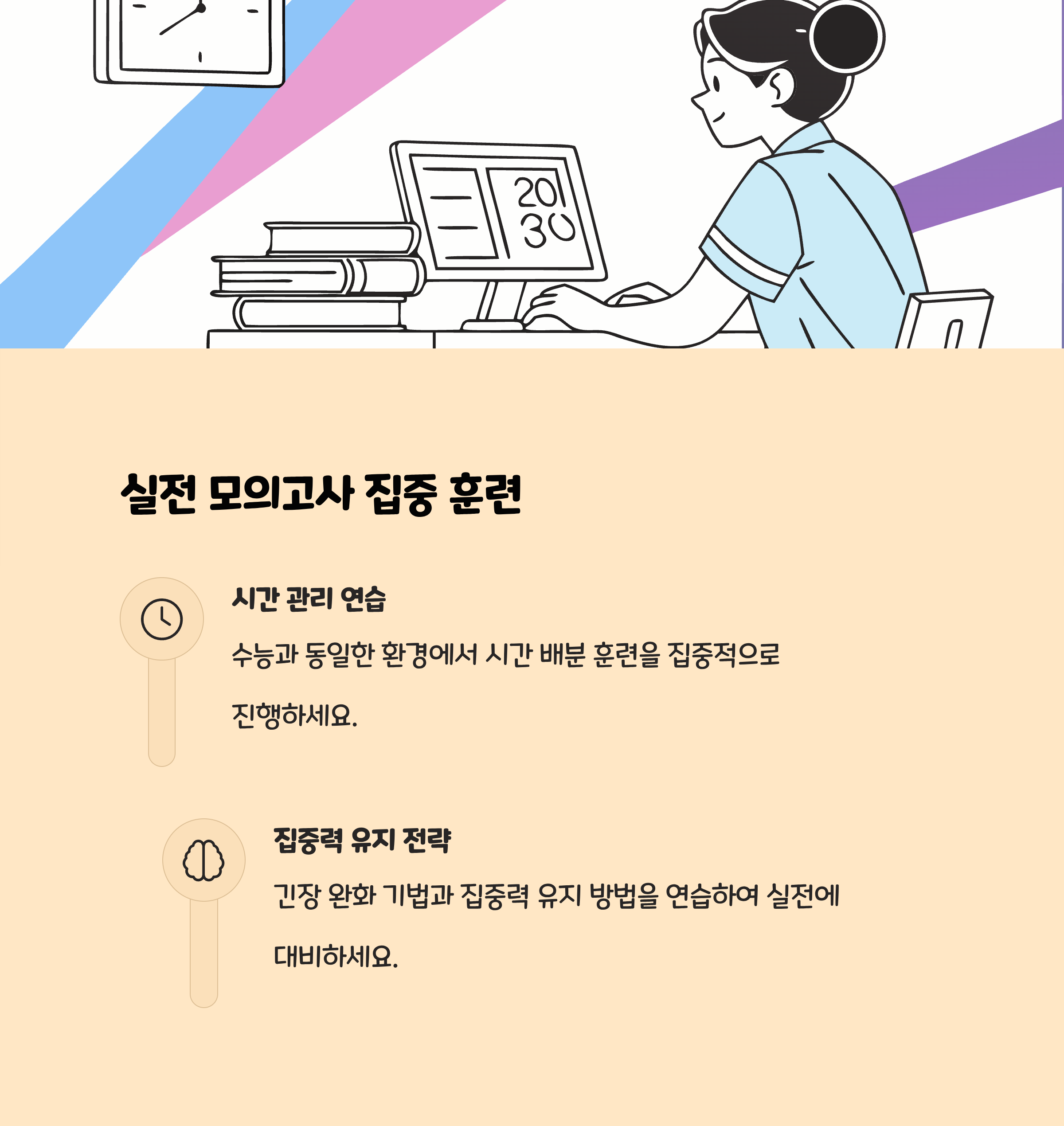 주 1회 이상 전범위 모의고사를 시간 제한 내에 풀어 실제 시험과 비슷한 환경에서 실전 감각을 키워야 합니다. 시험지 내에서 자신에게 맞는 문제 풀이 순서를 찾아 시간 배분 전략을 세우는 것도 중요합니다. 특히 독서 지문은 시간 배분에 유의하며 문제 근거를 빠르게 찾는 훈련이 필요합니다.
