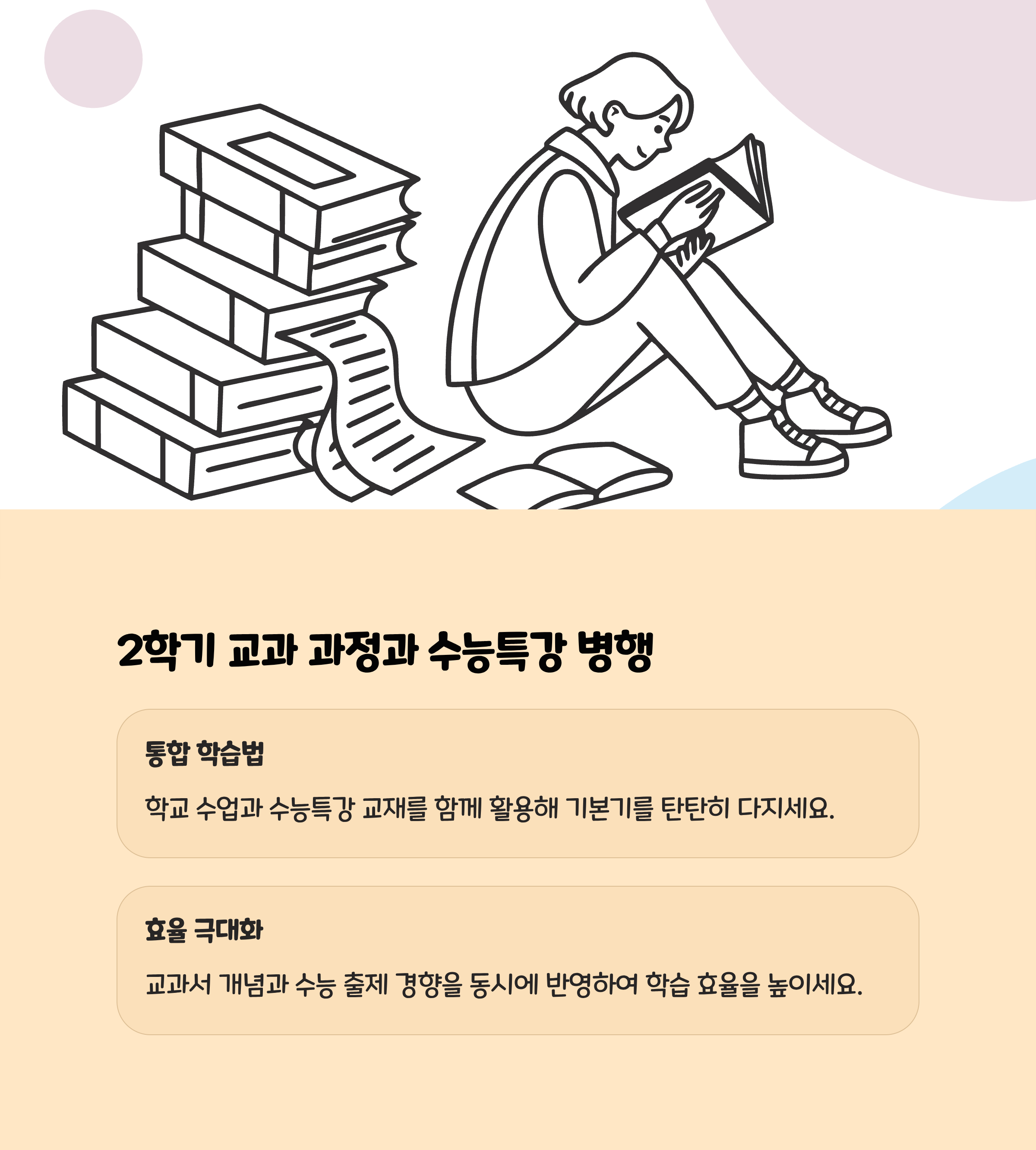 2학기에는 학교 교과서에 충실하면서, EBS 수능특강과 수능완성 교재를 병행하는 것이 효과적입니다. 특히 독서와 문학 영역의 기본 개념과 유형을 반복 학습하며, 최신 기출 트렌드와 신유형 문제에도 대비할 수 있습니다.