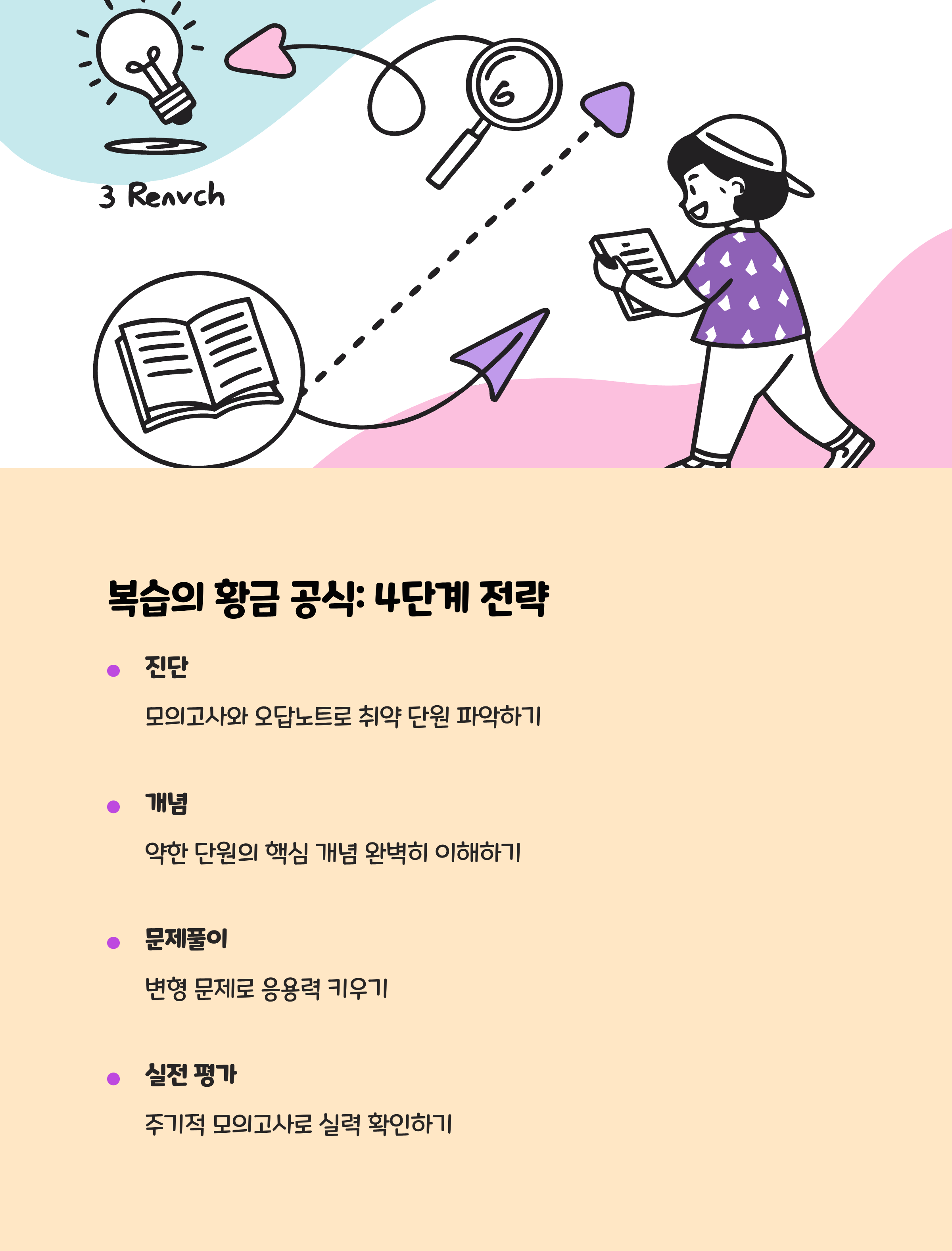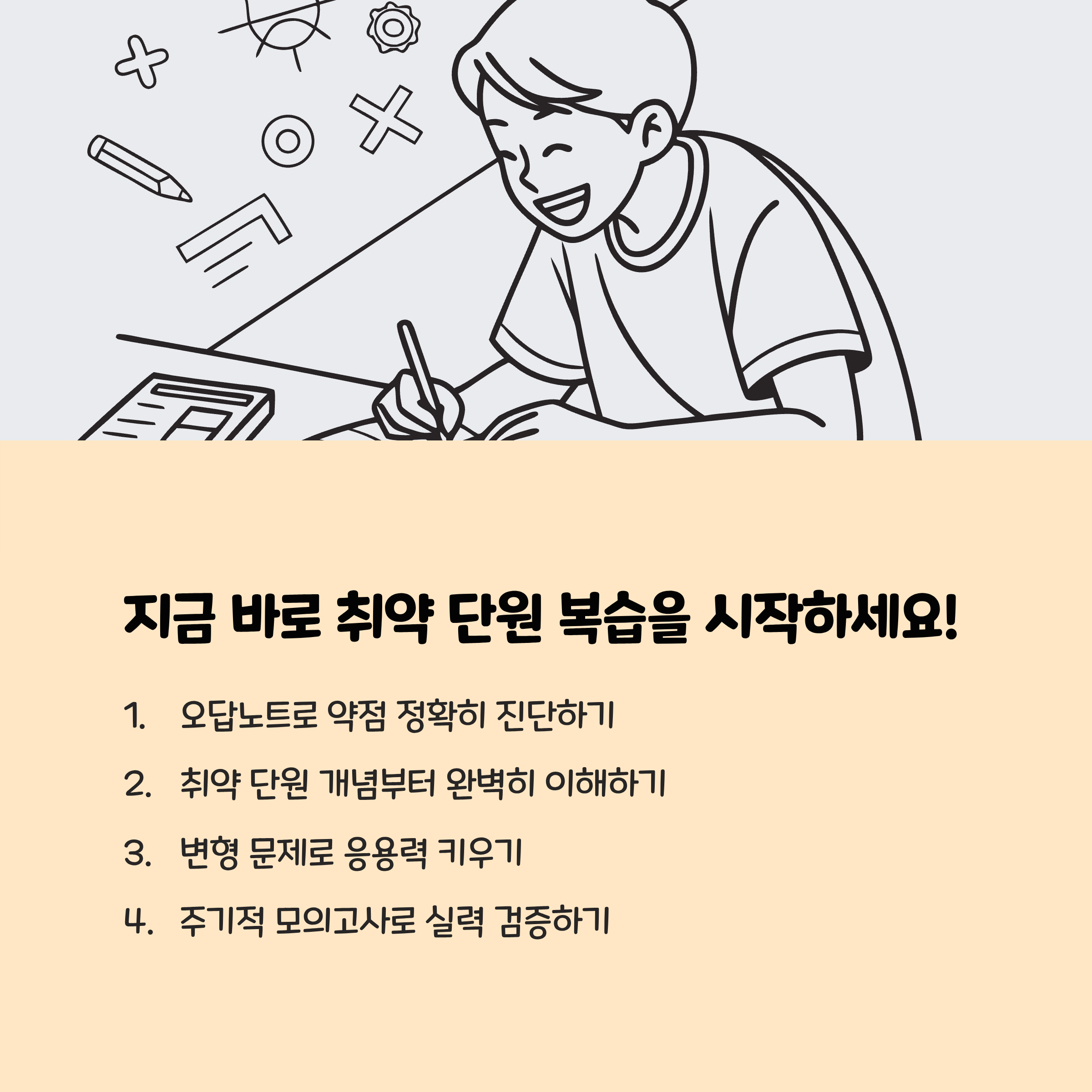 취약 단원 집중 복습의 핵심은 '내 문제를 정확히 파악하고, 개념과 실전 연습을 병행하며, 오답을 분석하는 것'에 있습니다. 무작정 양만 늘리는 것이 아니라, 약한 부분을 명확히 진단하고 반복적으로 보완하는 전략이야말로 성적 역전의 지름길입니다.