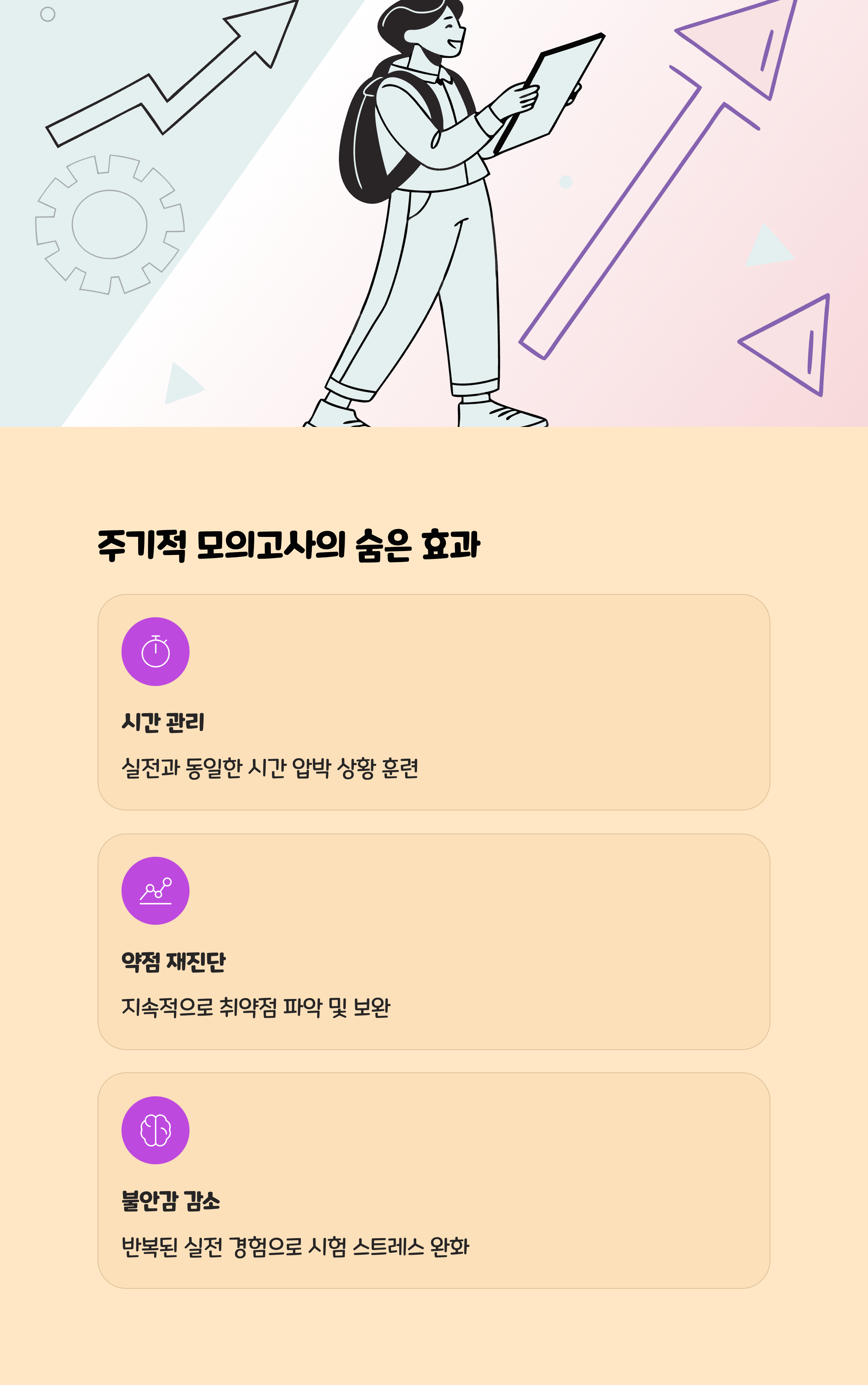 매주 모의고사나 단원별 실전 테스팅을 반드시 실시하세요. 실제 시험과 같은 환경에서 시간 배분, 문제풀이 속도, 실수를 점검하는 것이 실전력을 높입니다.- 중요한 것은