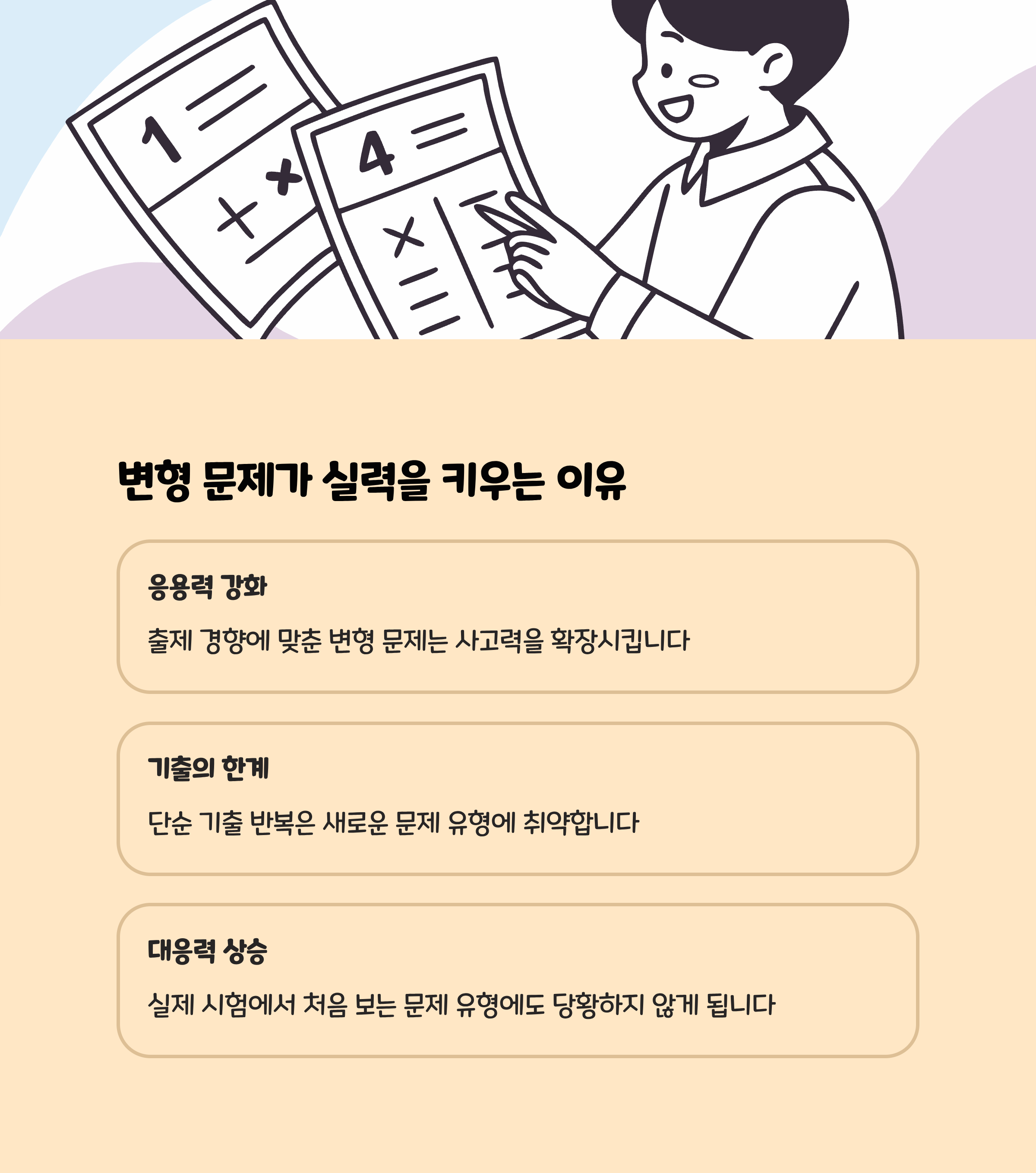- 공식 외우기에만 그치지 말고 ‘왜 그런지’에 집중하세요. 대표적인 취약 파트(미적분, 함수, 수열, 확률통계 등)는