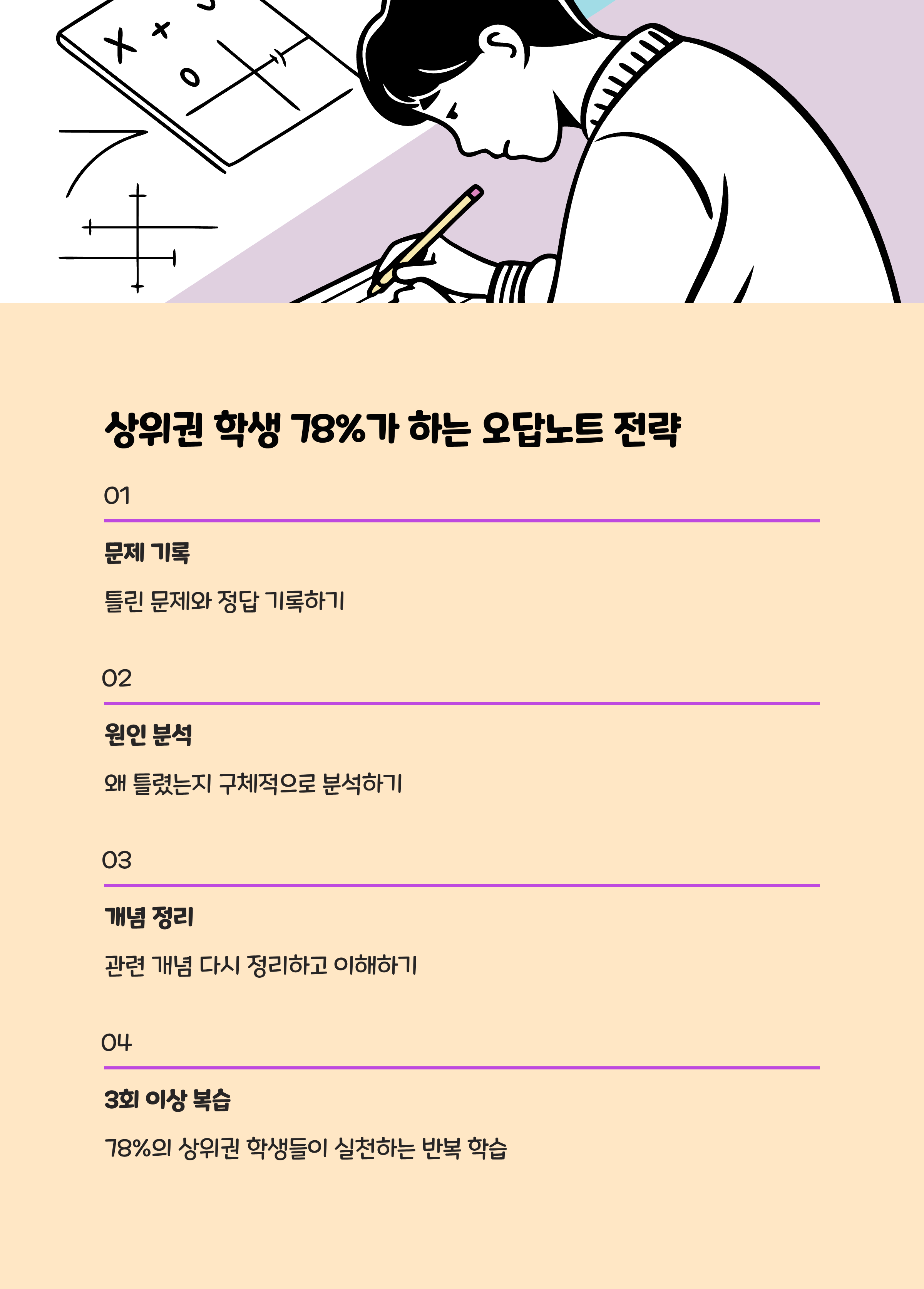 오답노트 관리가 점수 ‘도약’의 핵심입니다. 단순히 답만 외우지 말고 왜 틀렸는지, 어떤 개념에서 막혔는지 원인을 상세하게 기록하세요.- 통계적으로, 중위권에서 상위권으로 올라간 학생들 78%는 오답노트 내 틀린 문제를 최소 3회 이상 리뷰한다고 응답했습니다.