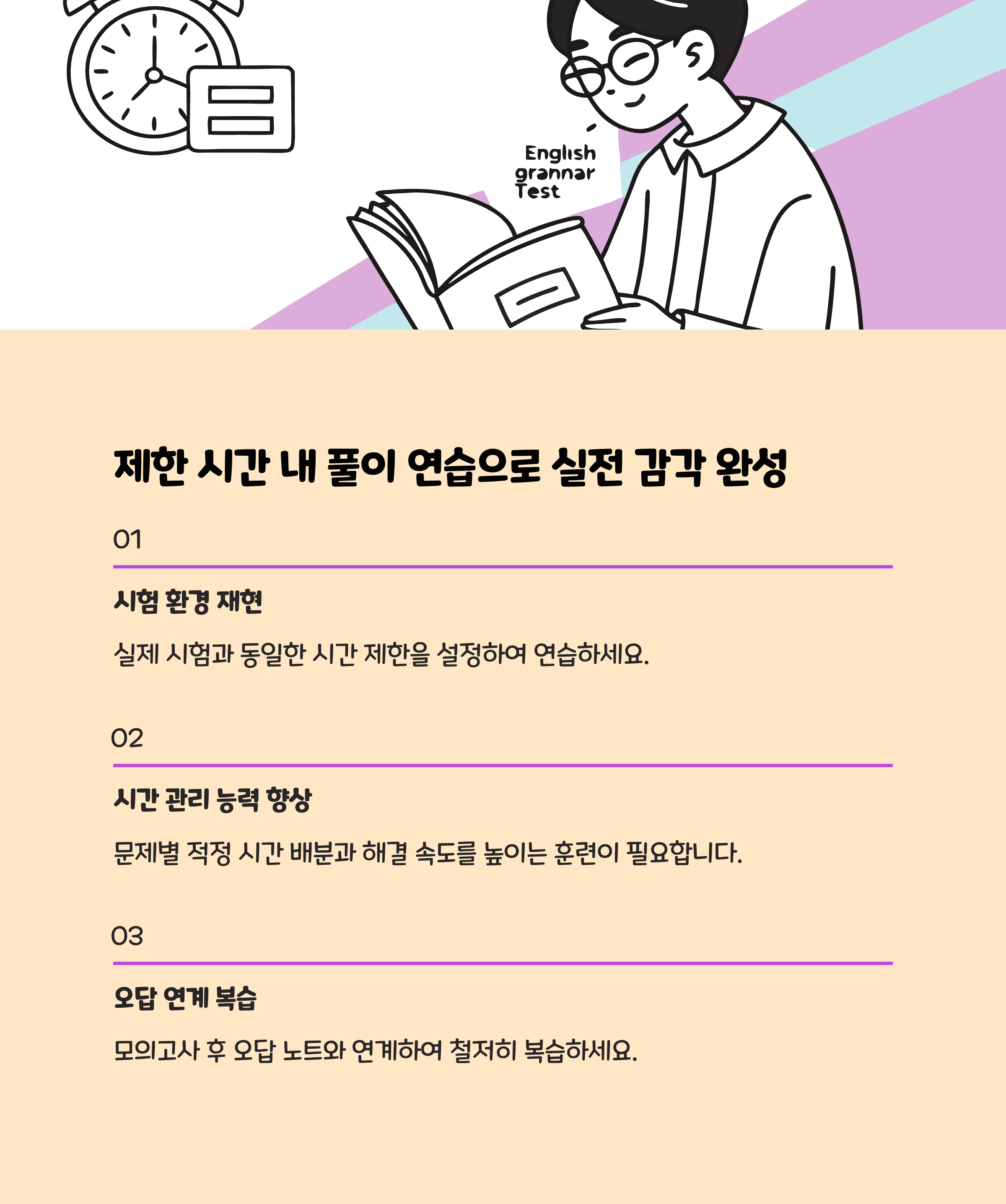 기본 개념 점검: 약한 문법 사항은 문법책이나 정리 노트를 통해 기본 원리를 하나하나 다시 확인합니다. 예를 들어 ‘to부정사’, ‘준동사’, ‘가정법’ 등 주요 문법 포인트를 정확히 이해해야 문제를 풀 때 혼란이 없습니다.문제 풀이에 전략 적용: 각 문제 유형별로 문제를 풀 때 시간을 제한하며 푸는 연습을 합니다. 빈칸 문제는 앞뒤 문맥 파악에 집중하고, 문장 삽입 문제는 앞뒤 문장 흐름과 접속사 표현을 꼼꼼히 살핍니다.오답 노트 활용: 틀린 문제는 ‘왜 틀렸는지’를 기록하고, 관련 개념을 다시 복습하여 실수를 반복하지 않도록 합니다.