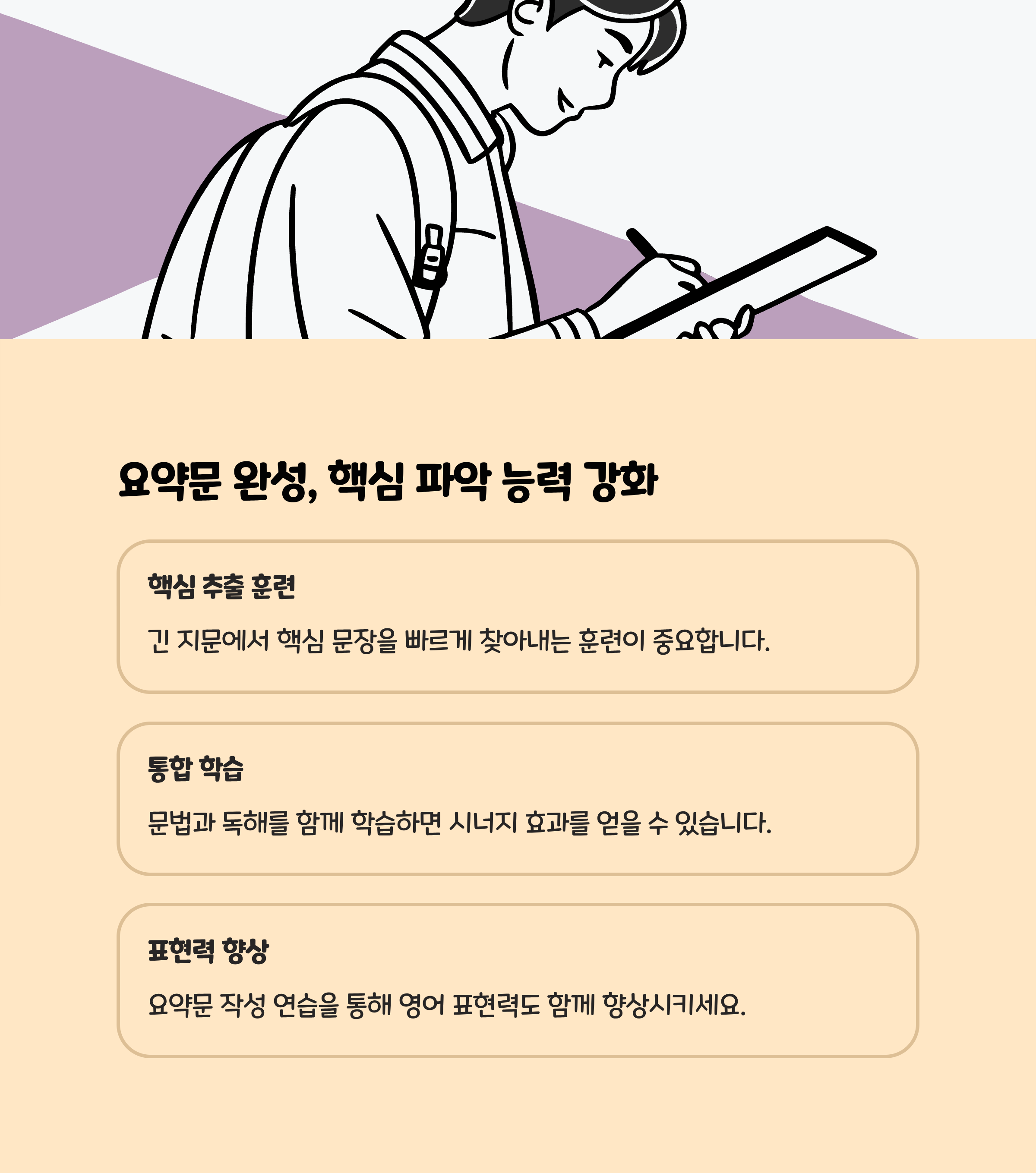 | 요약문 완성 | 중요한 정보 선별과 문법적 연결 능력 | 요약문 읽고 빈칸 주변 문장 분석 |