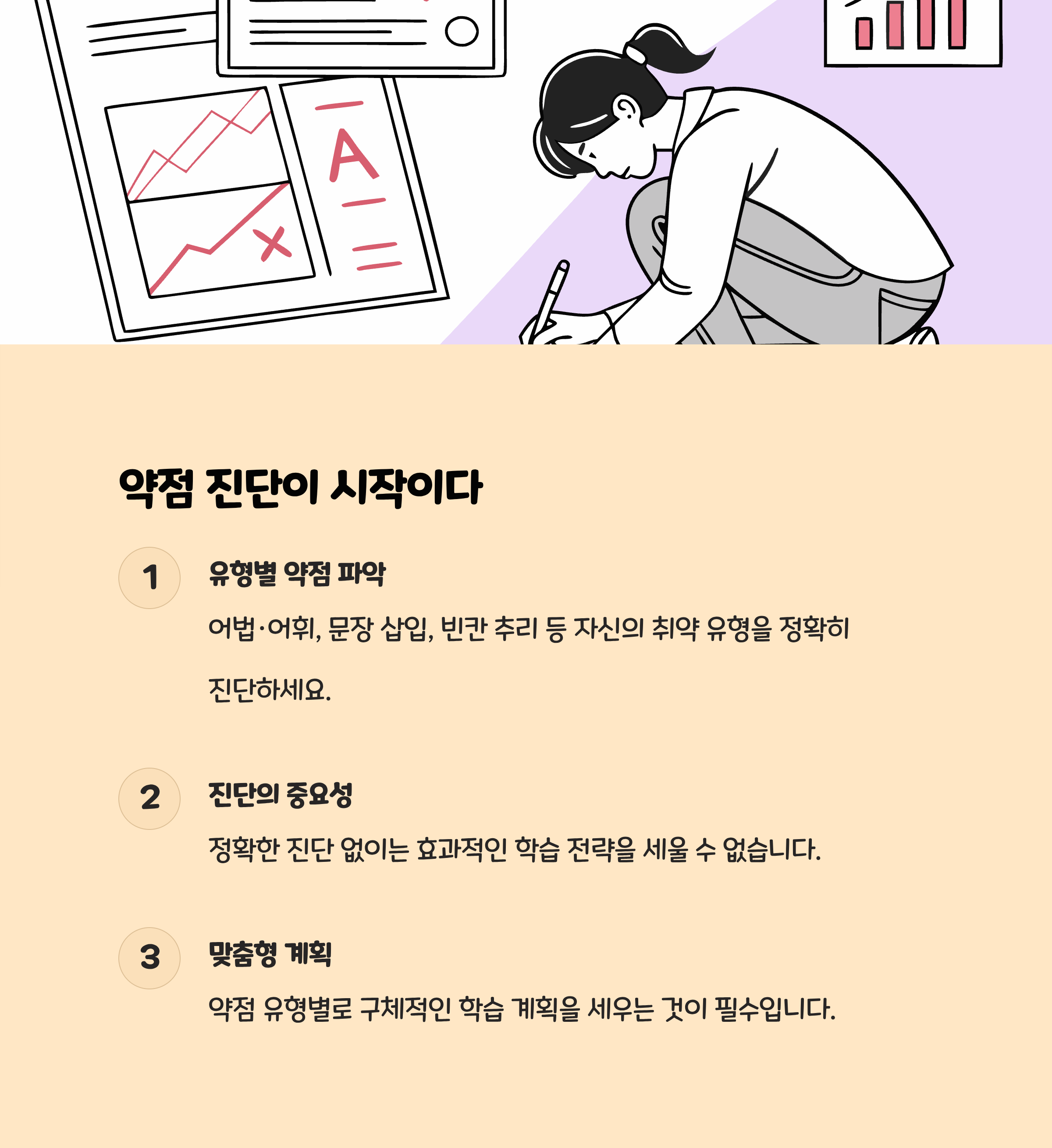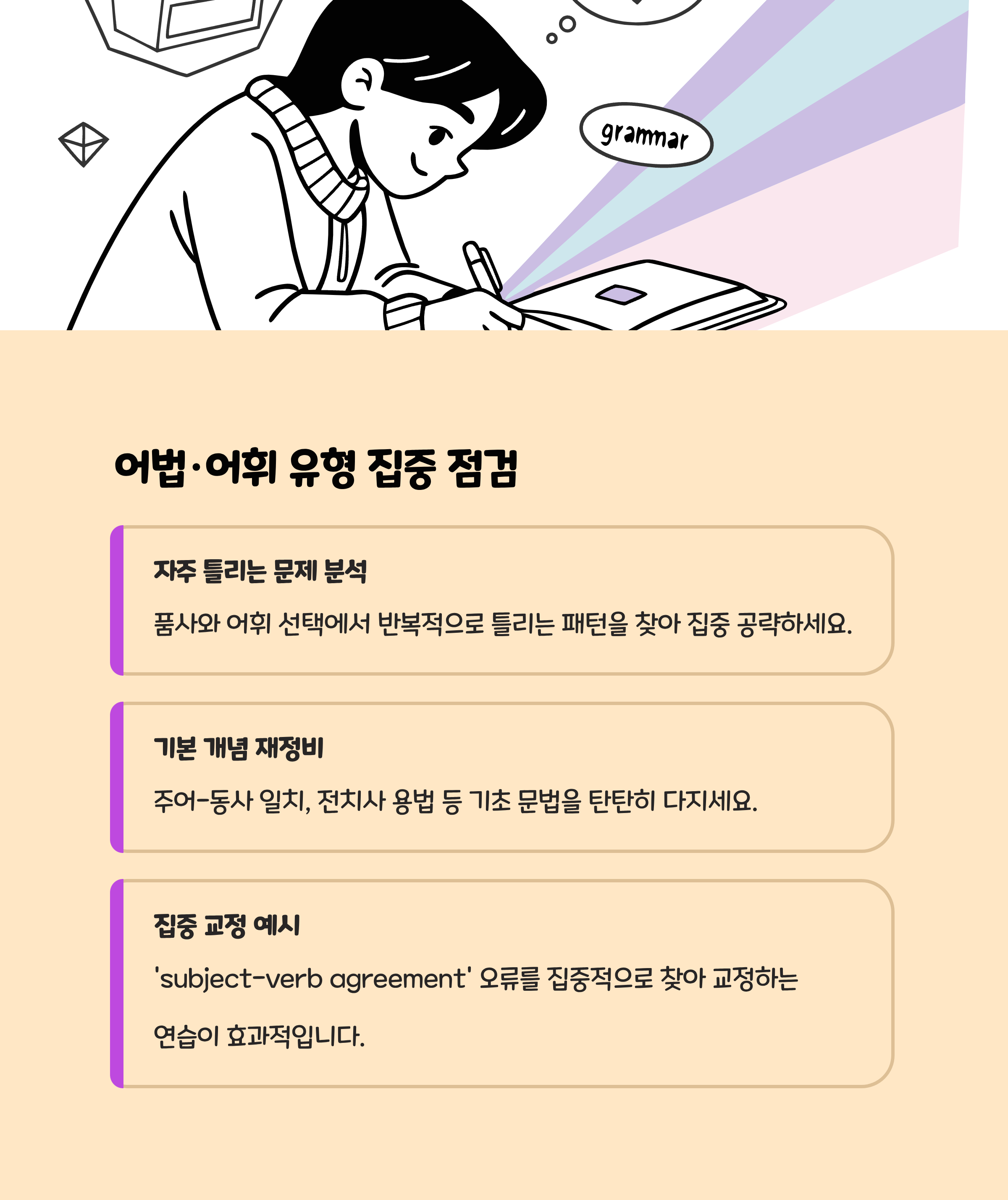 꾸준한 반복과 점검이 무엇보다 중요합니다. 문법이 어렵고 지루할 수 있지만, 제대로 된 방법으로 정확히 약점을 파악해 공부한다면 점수 향상은 물론 영어 실력 전반에 큰 도움이 됩니다. 하루 30분 이상 꾸준히 시간을 내서 핵심 개념과 문제 유형을 정복해 보세요.