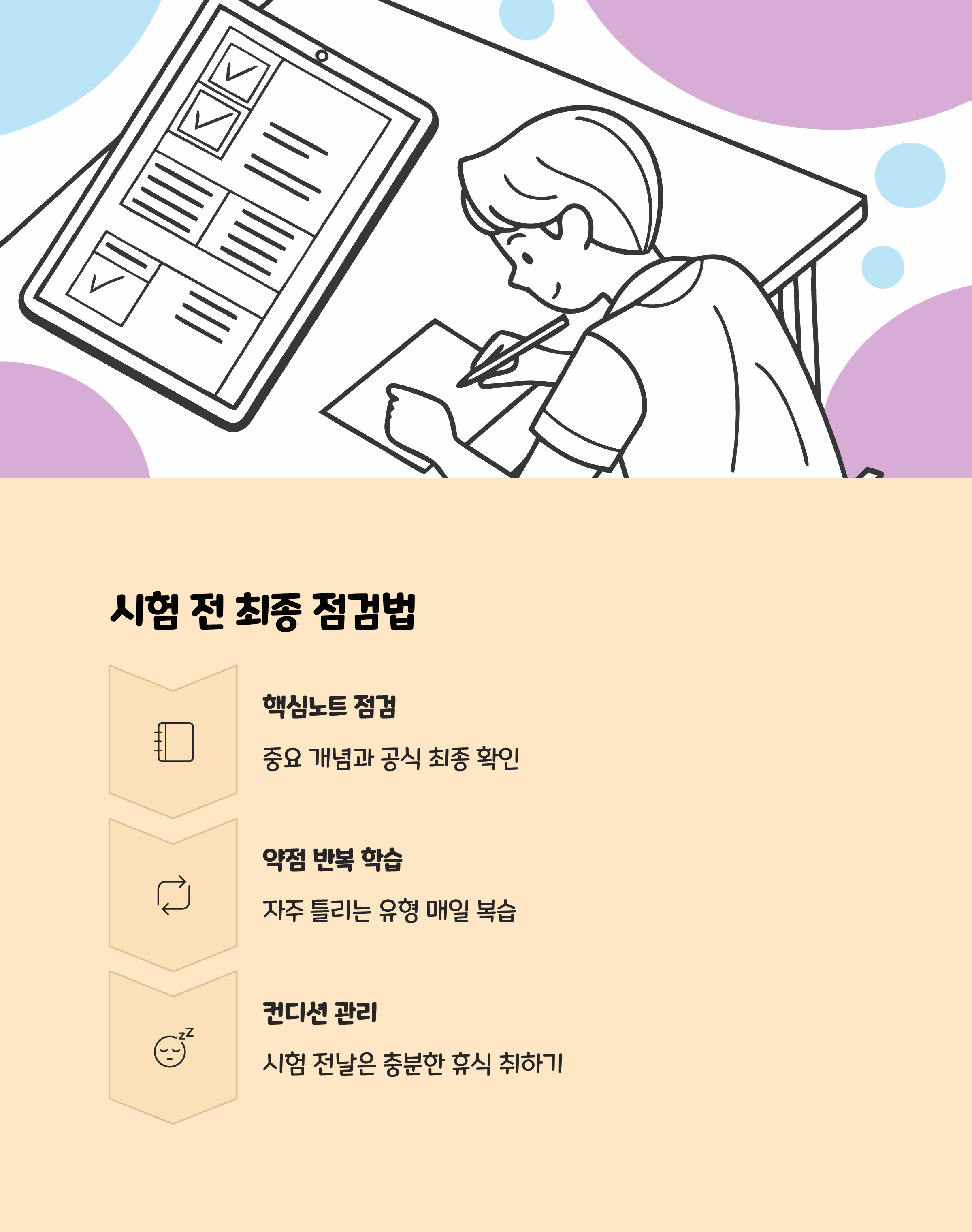 시험 직전에는 빠르게 핵심 개념 노트와 오답노트를 돌려보면서, 중요한 포인트를 여러 번 반복 학습하는 것이 중요합니다. 이때 ‘왜 틀렸는지’를 다시 한번 점검하며 복습하면, 단순한 기억이 아닌 개념 이해가 깊어집니다.