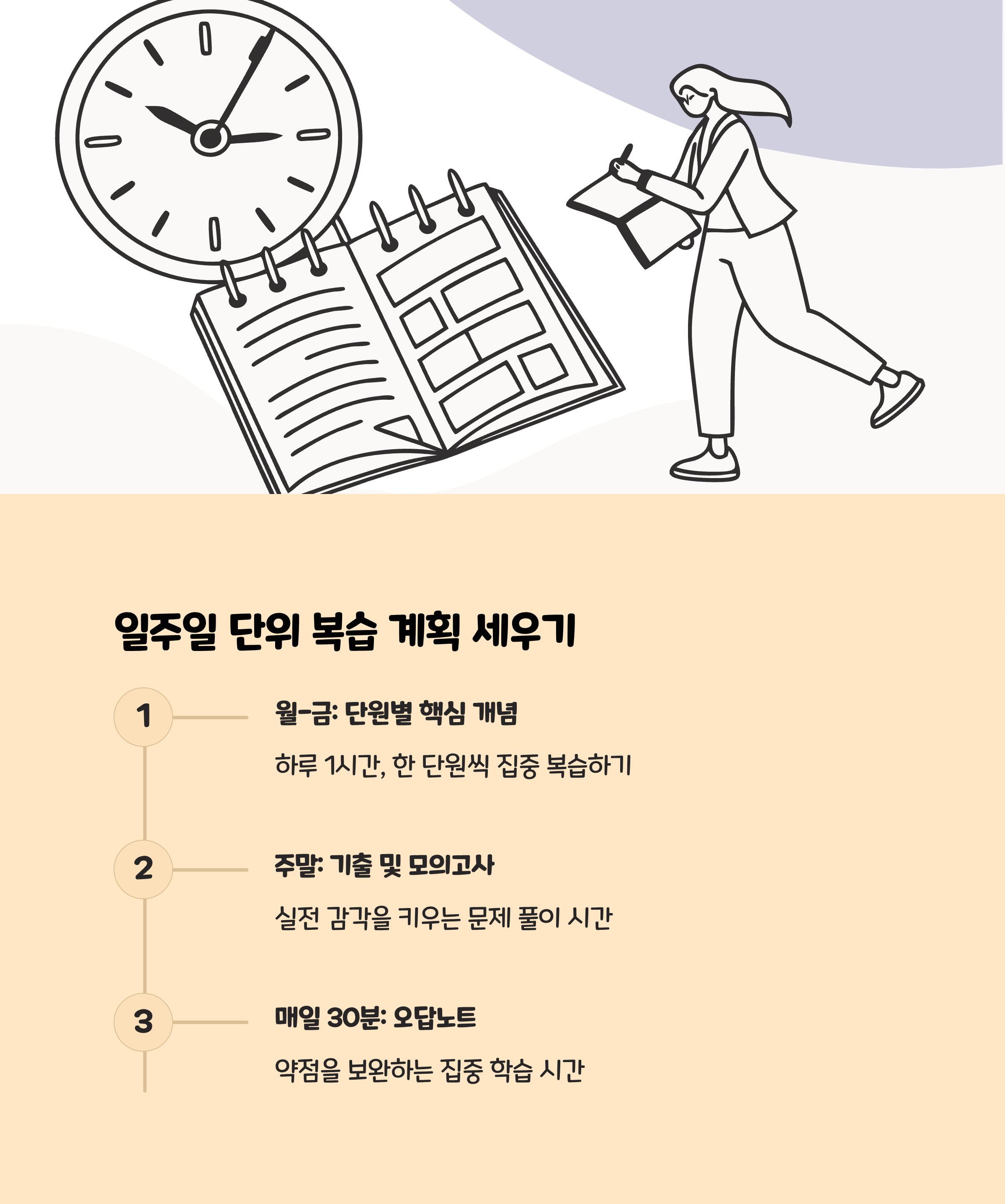 효율적인 복습을 위해서는 자신만의 학습 스케줄 설정과 관리가 필수입니다. 예를 들면, 한 주에 3단원씩 나누어 복습하고, 매일 30분씩 핵심 개념과 문제풀이에 집중하는 방식입니다. 특히 시험 2~3주 전에는 ‘복습 + 실전 문제풀이’를 병행해, 장기 기억으로 전환할 수 있게 해야 합니다.
