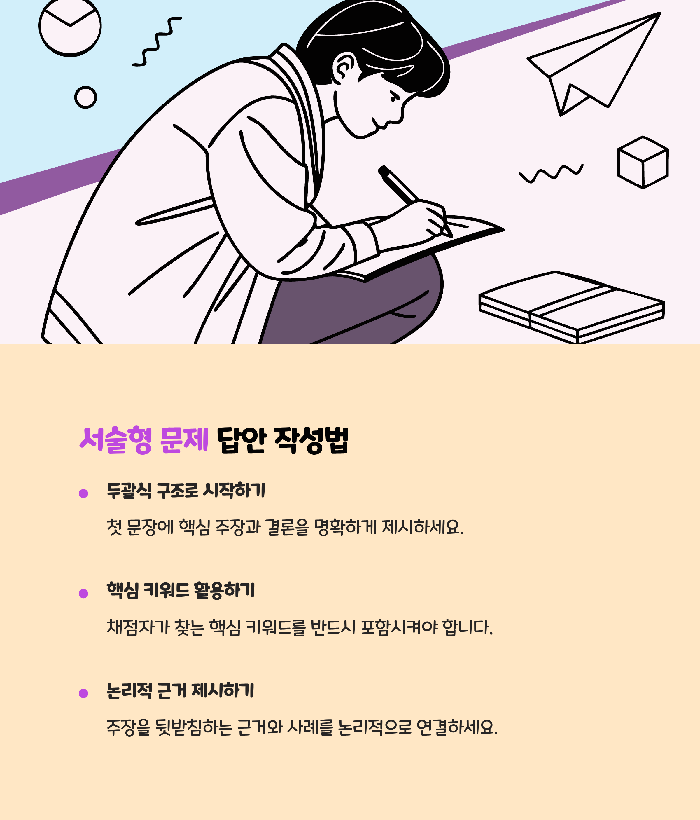 서술형은 두괄식 답변 구조로 질문 키워드를 정확하게 파악하고 근거와 사례를 명확히 제시하는 훈련이 필요합니다. 주장-근거-사례-결론 형식을 일관되게 연습하는 것이 중요합니다.