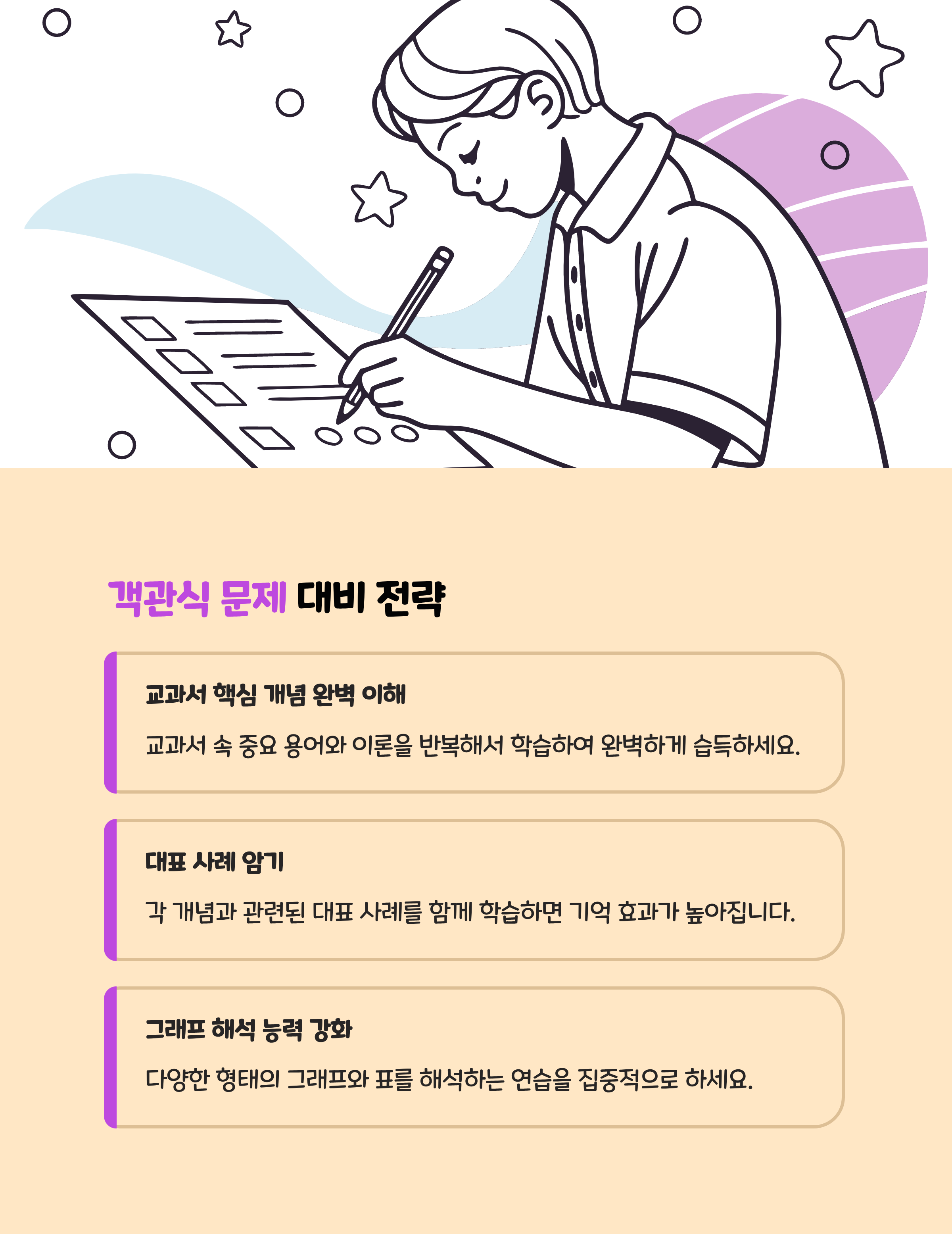 객관식은 교과서 개념과 사례를 반복 학습하고, 표와 그래프 등 시각 자료 해석 연습이 중요합니다. 다양한 문제를 풀어보며 개념을 체계적으로 연결하고 이해하는 것이 객관식 고득점의 핵심입니다.