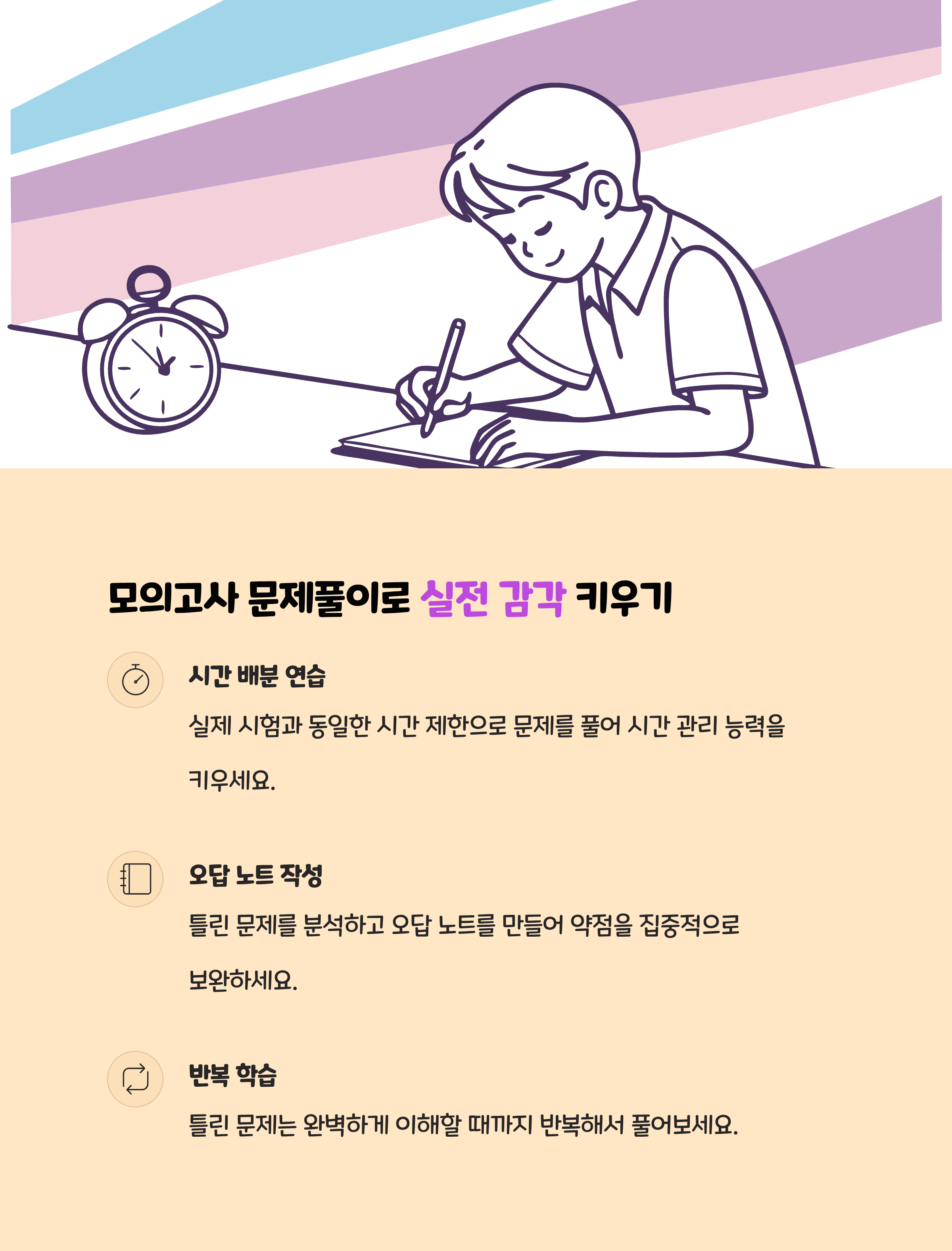 일주일에 2~3회 모의고사 풀기를 추천합니다. 문제 풀이 후 오답 노트 작성과 서술형 답안 첨삭을 통해 약점을 보완하는 과정이 중요합니다.