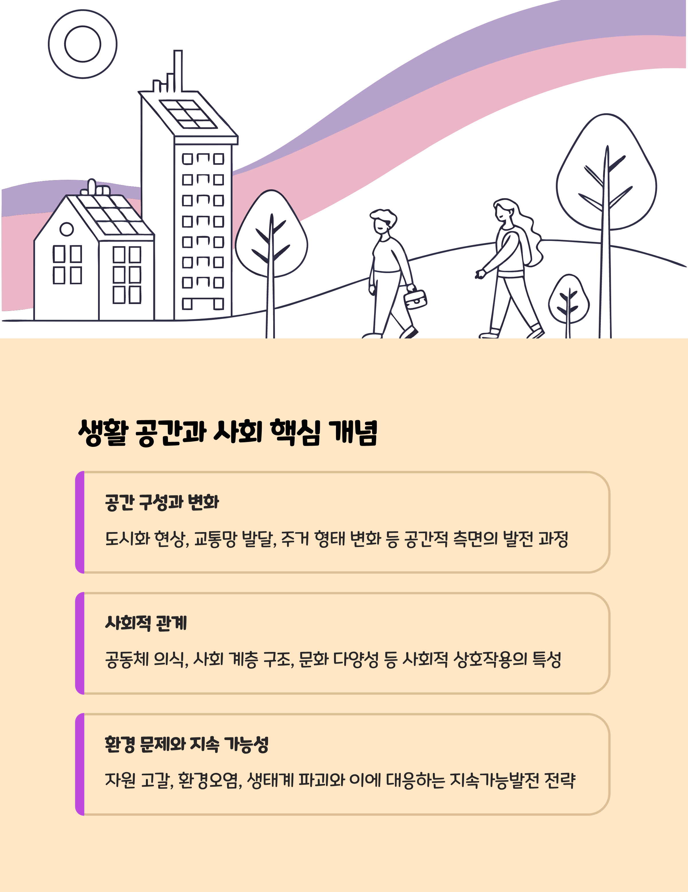 | 생활 공간과 사회 | 산업화, 도시화, 녹지, 집약 | 도시화 현상, 녹지·생태 변화 |