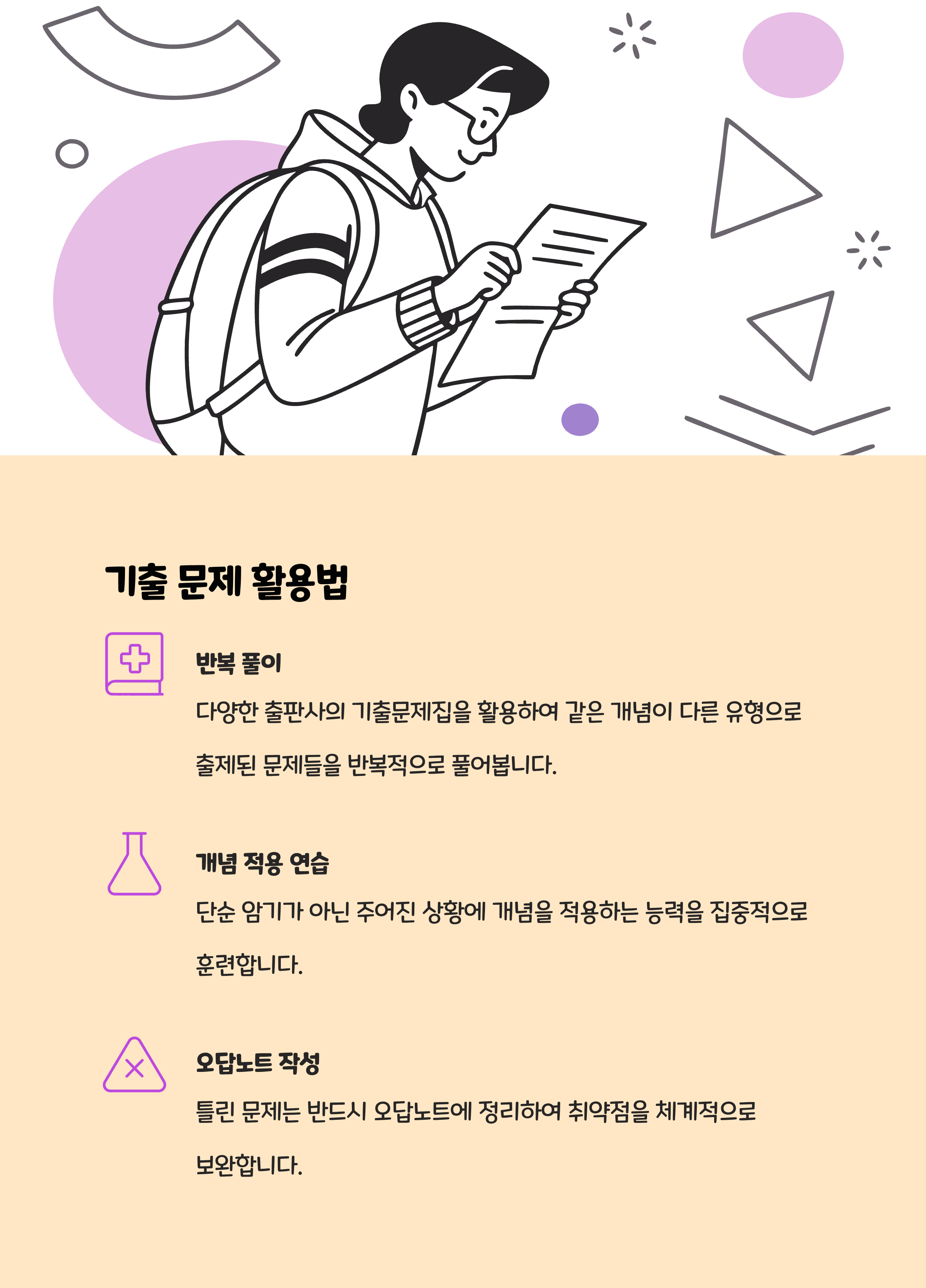 개념 암기만으론 부족!개념을 짧게 요약 → 다양한 실제 문제 적용 반복문제 풀이: 고난도·융합형 문제 비중 늘리기(수능 예시 기준 고1 내신, 고2 심화, 고3 실전 순으로 단계별 적응)