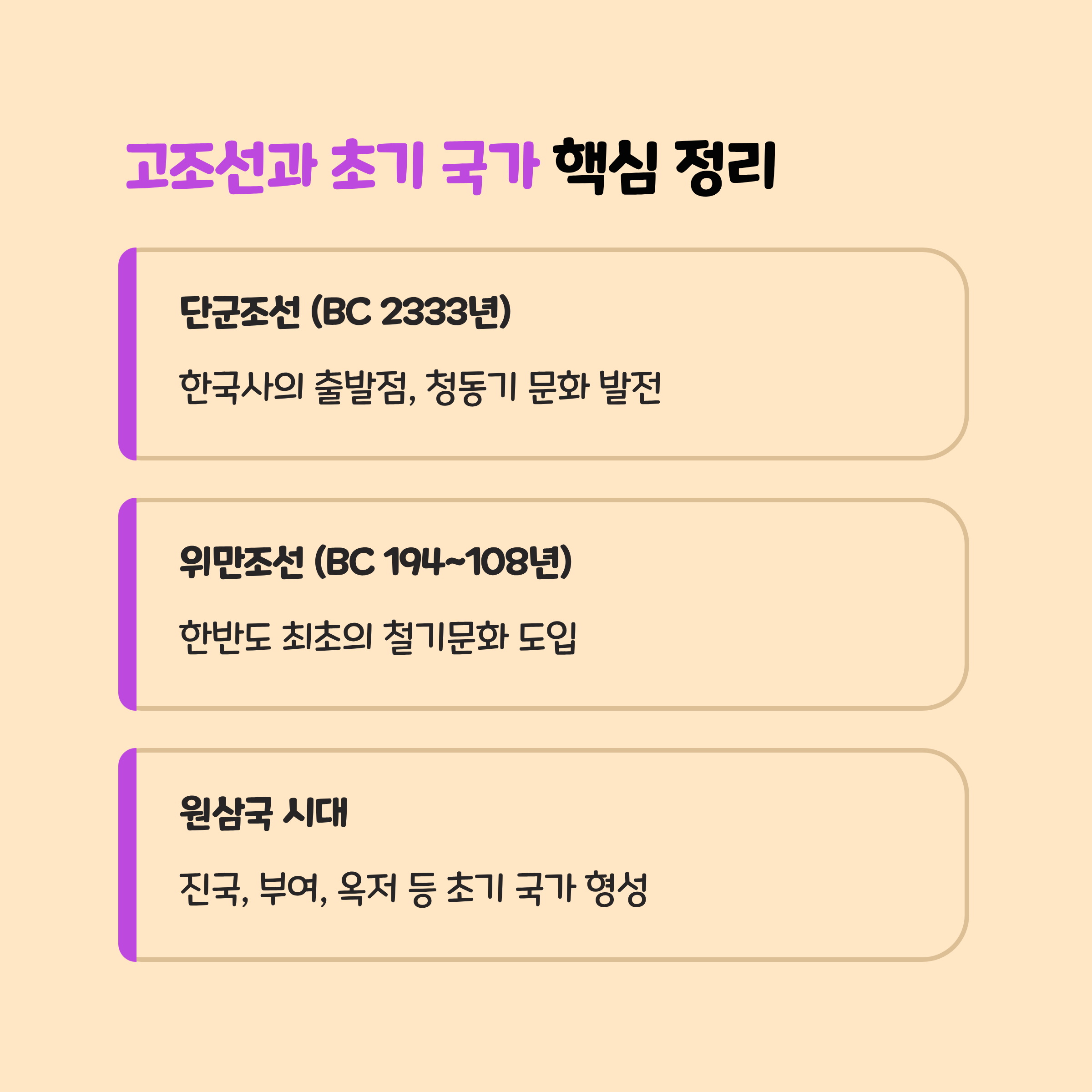• 각 시기별 혁명적 전환점(예: 3.1 운동, 임진왜란)만 집중 암기